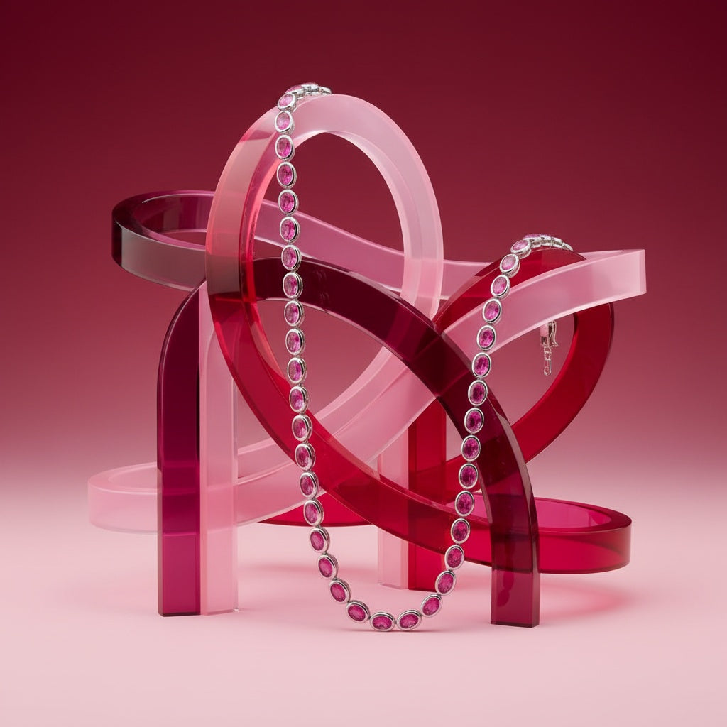 Tennis bracelets and minimalist designs glowing in pink and red.