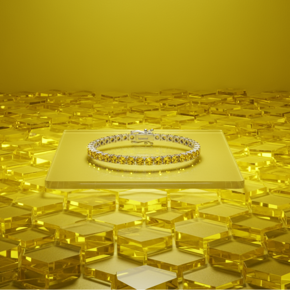 Tennis bracelets and minimalist designs in vibrant yellow and orange.