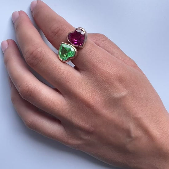 Twin bezel-set heart stones on a ribbed sculptural band