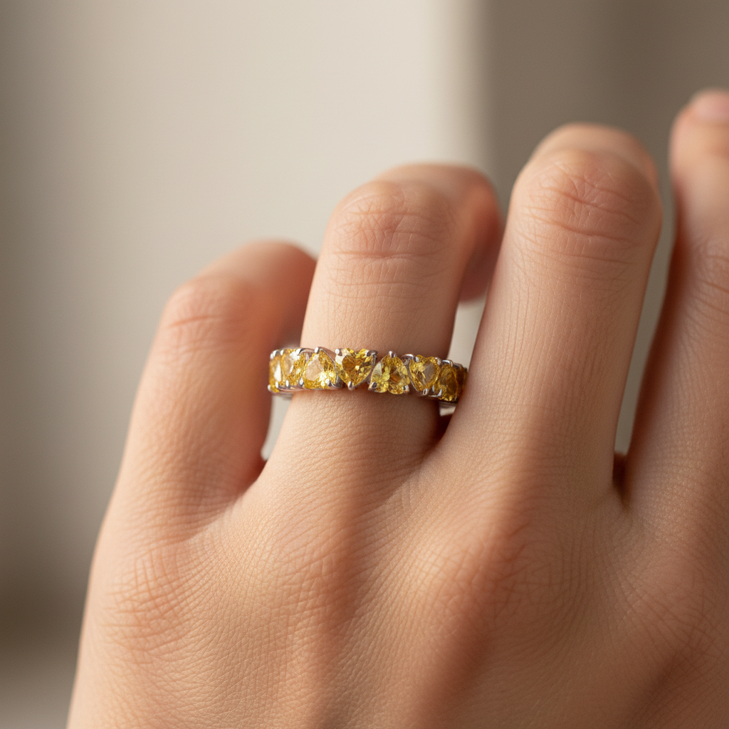 The Amore Eternity Ring reinterprets the eternal band with a playful rhythm of alternating heart-shaped stones - one facing up, the next down - all the way around. Prong set, minimal setting, the design creates a pulse of sparkle and sentiment with every angle. Joyful, graphic, and symbolic, it’s a love story cast in repetition. Available in all Atlas Carré signature colours.