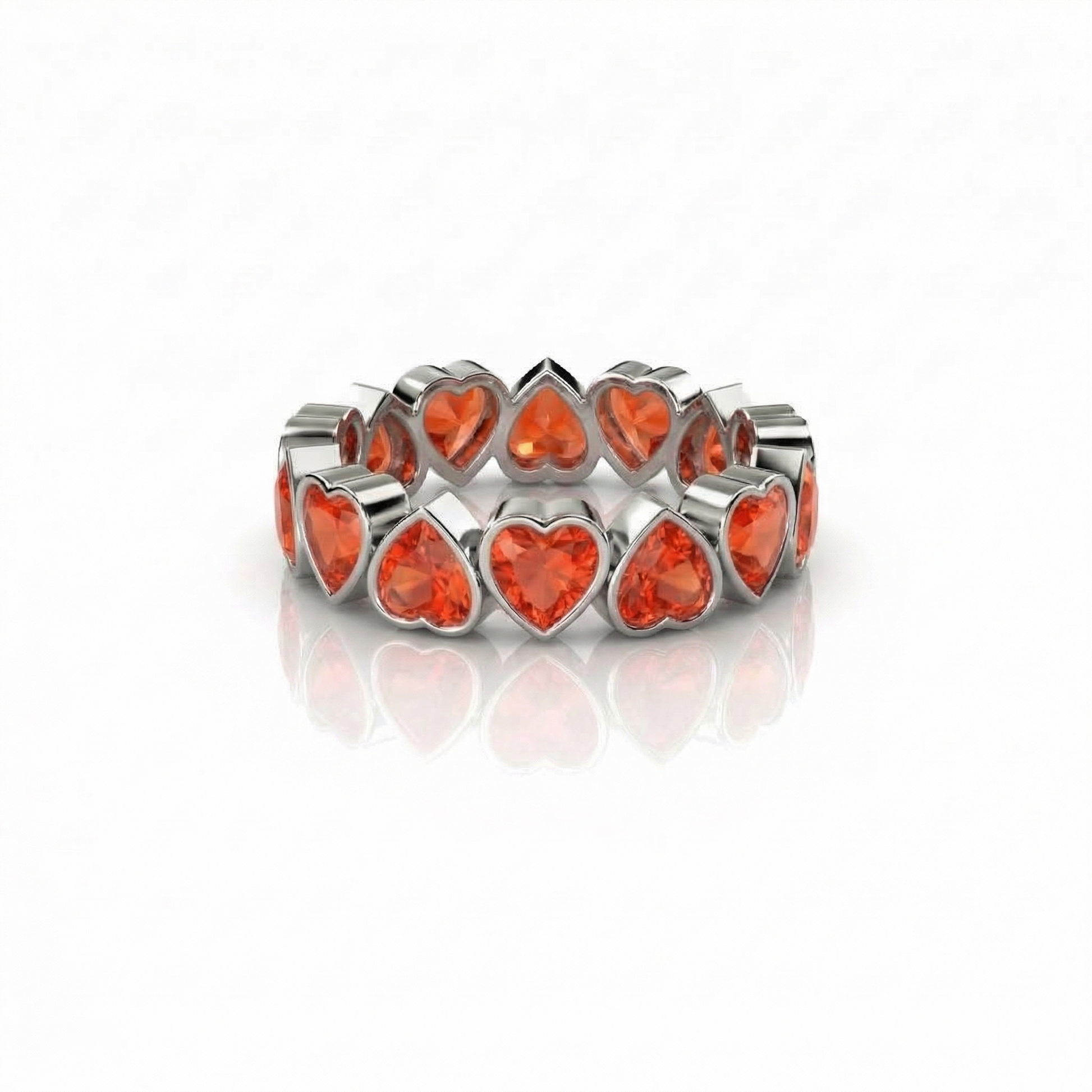 The Amore Frame Eternity Ring reinterprets the iconic heart band at grander scale. Larger, bezel-set heart gemstones encircle the band in alternating directions - one upright, one inverted - creating a rhythmic flow of colour and light. The clean bezel outlines give each stone definition and presence, while the full-circle setting expresses love without end. Available in all Atlas Carré signature colours.