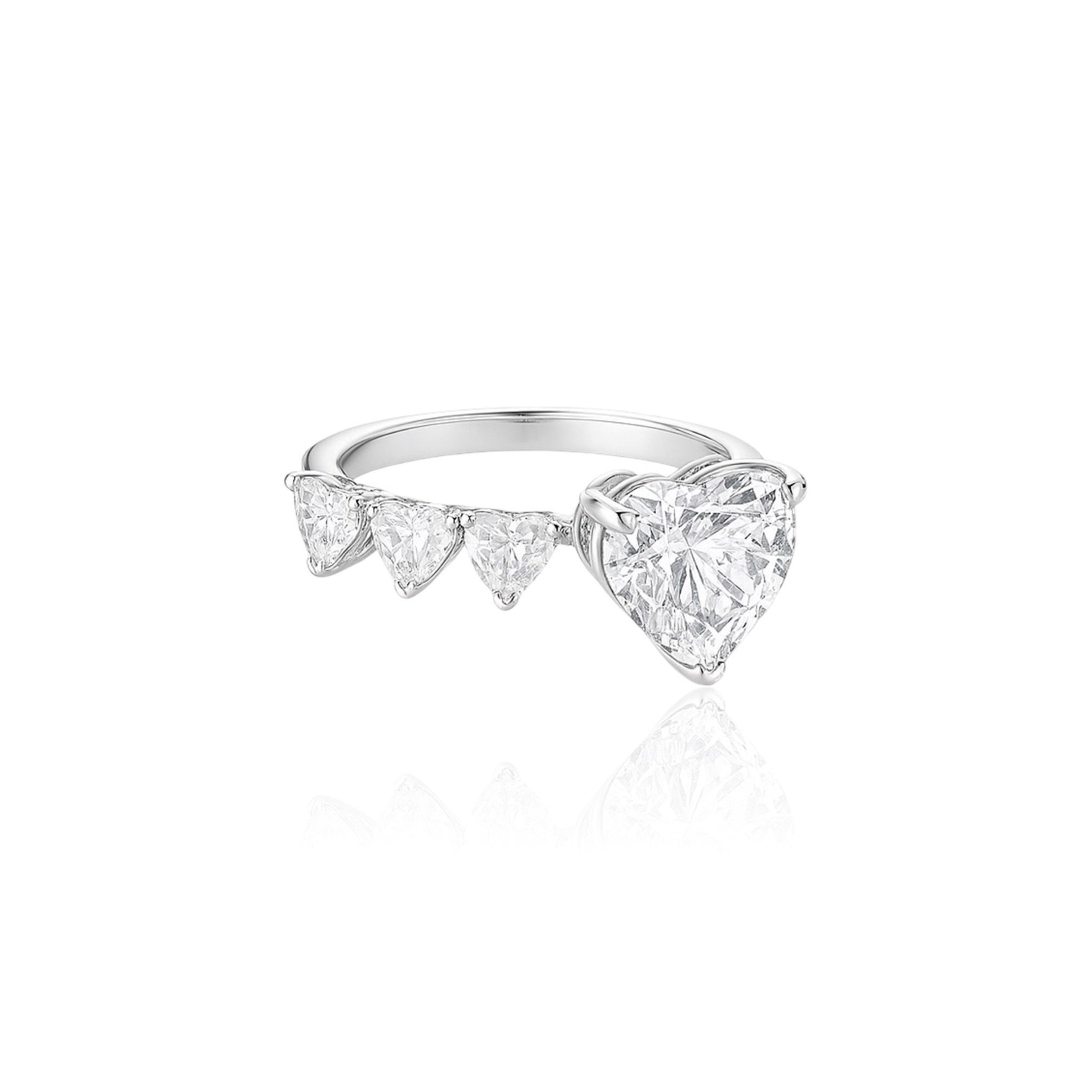 This open ring design features a large heart-cut centre stone on one side, balanced by three smaller heart-shaped stones on the other. The asymmetrical silhouette creates a playful yet refined look, ideal for stacking or wearing as a standalone statement. Crafted in precious metals with claw-set stones. Available in all Atlas Carré signature colours.