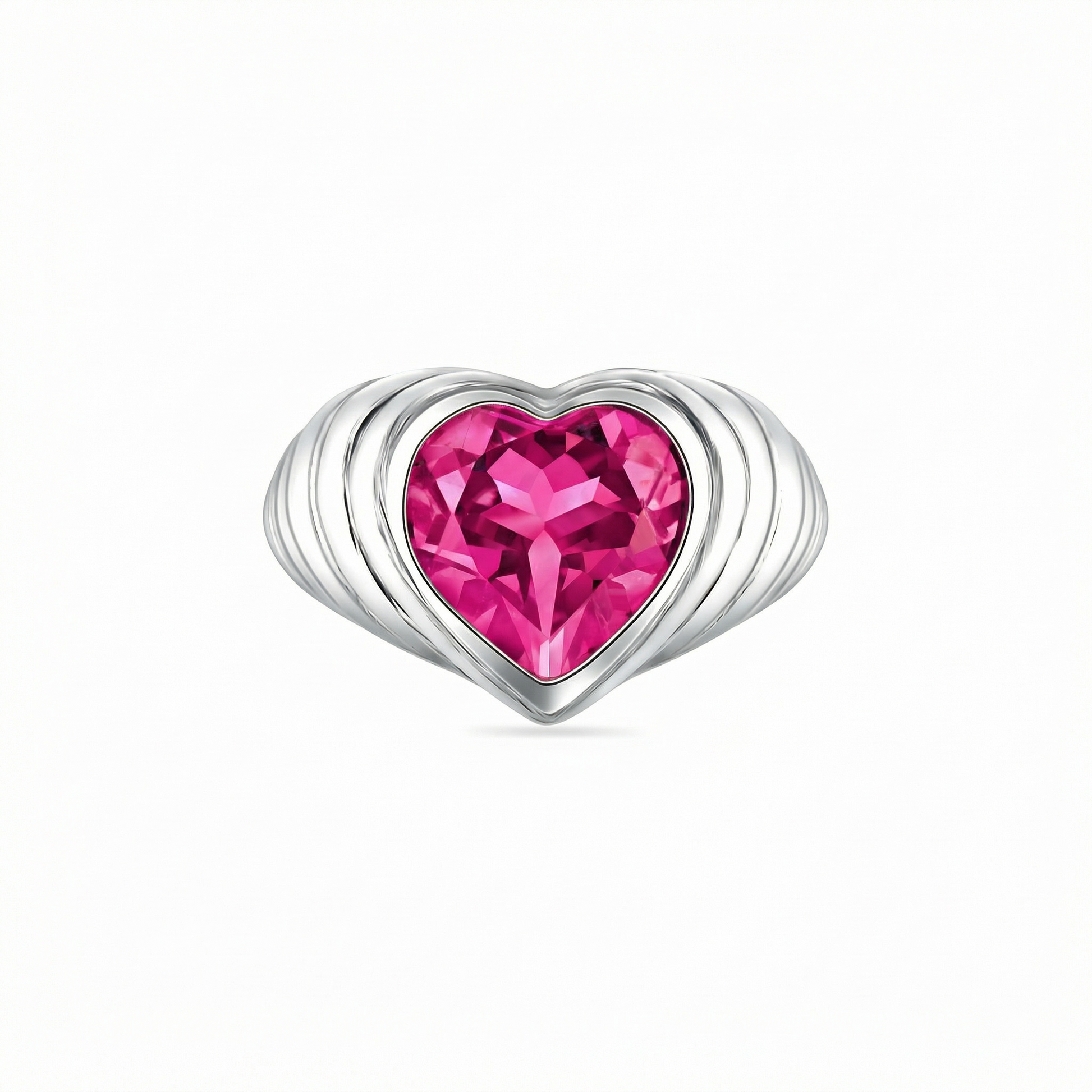 A contemporary take on the classic signet, this ring features a large 11x11 mm heart-shaped gemstone bezel-set into a contoured, ribbed band. The raised ridges give the piece a sculptural quality while enhancing the gemstone’s central focus. A confident design with strong presence and playful softness.