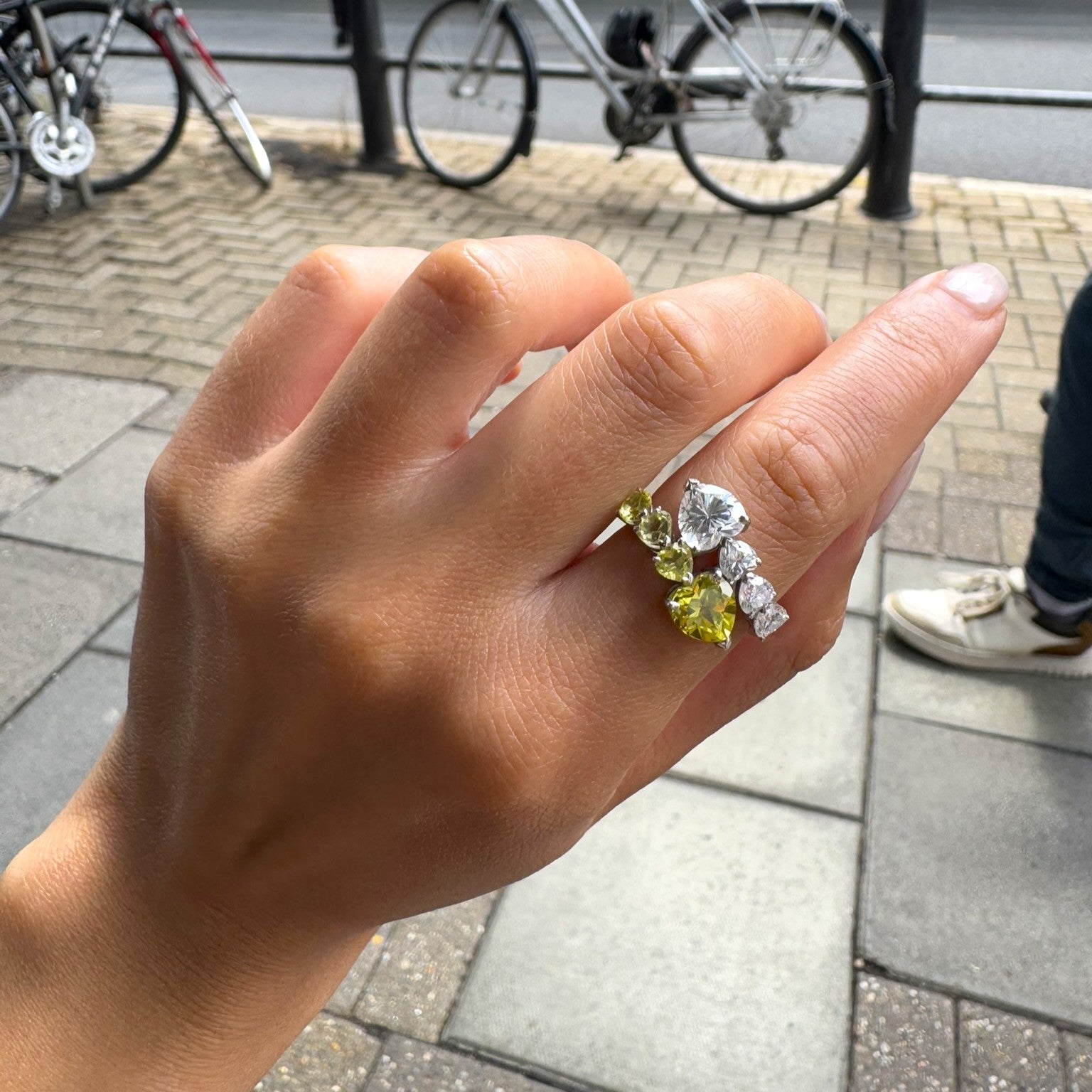 This modern wrap ring features a graduated sequence of heart-cut stones on each end of the band. One side is set with crisp White Diamonds, the other with vibrant coloured gemstones, creating a striking two-tone contrast. The twisted silhouette hugs the finger for a bold yet fluid effect, finished in polished precious metals. Available in all Atlas Carré signature colours.