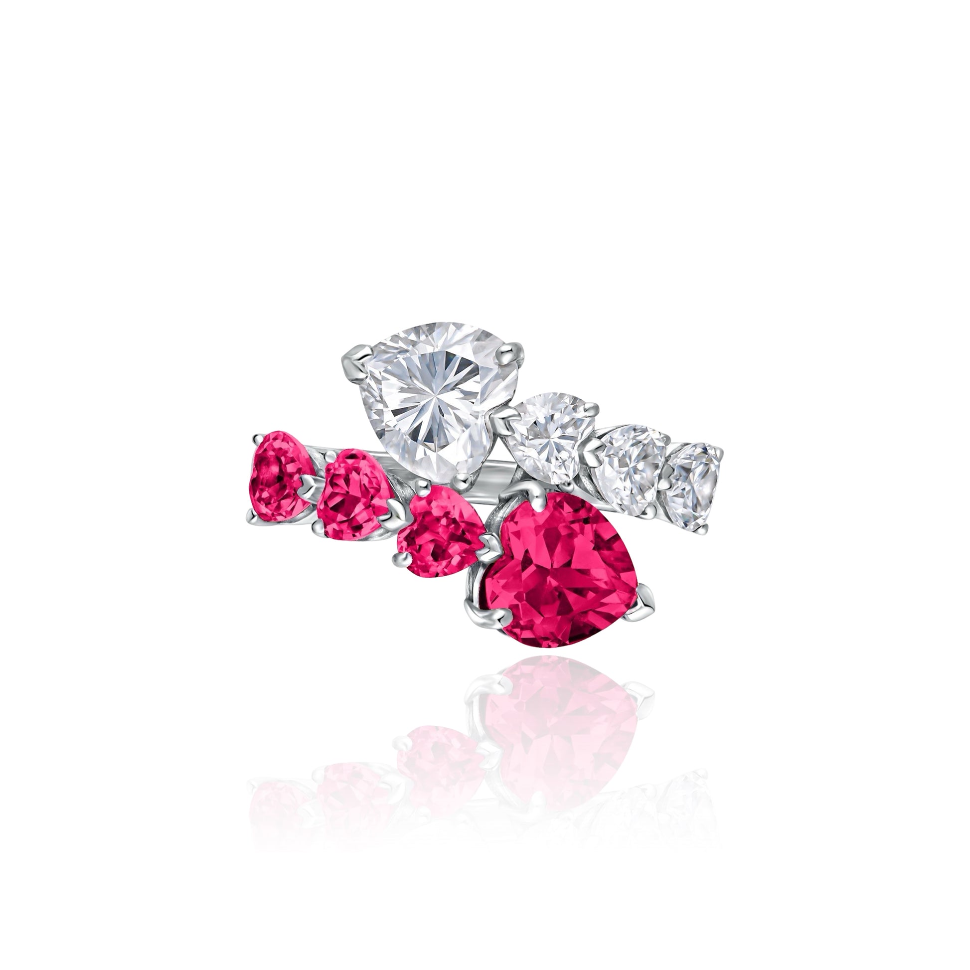 This modern wrap ring features a graduated sequence of heart-cut stones on each end of the band. One side is set with crisp White Diamonds, the other with vibrant coloured gemstones, creating a striking two-tone contrast. The twisted silhouette hugs the finger for a bold yet fluid effect, finished in polished precious metals. Available in all Atlas Carré signature colours.