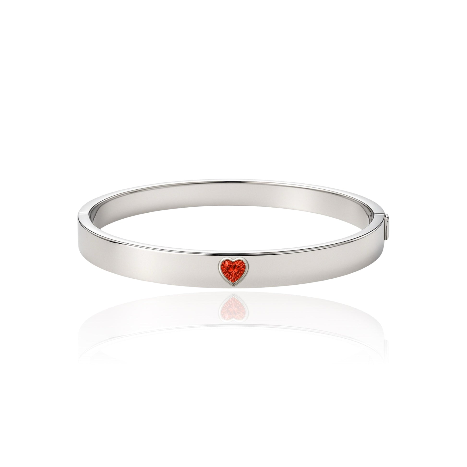 Medium oval hinged bangle with a flat-edge profile and a single bezel-set heart cut gemstone.