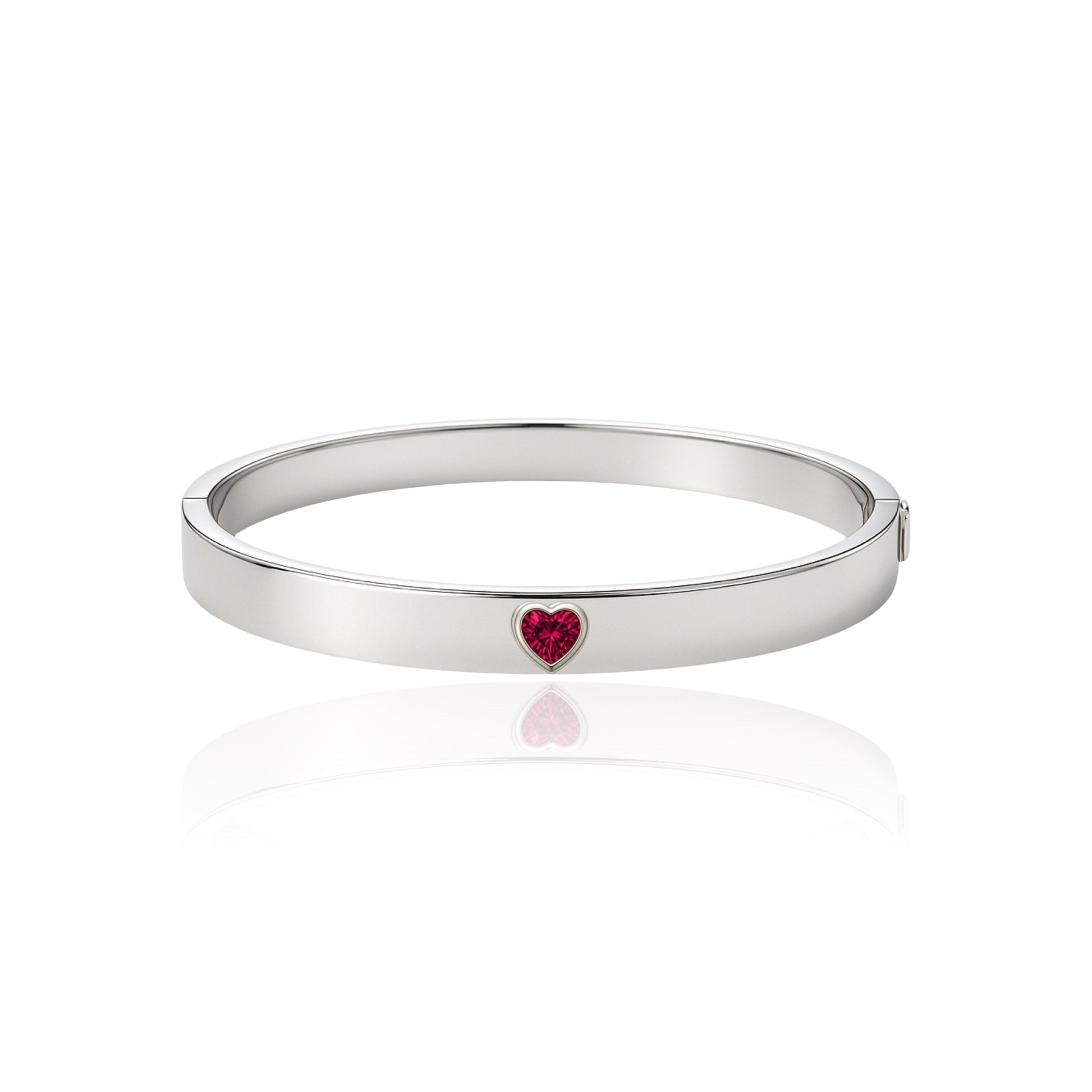 Medium oval hinged bangle with a flat-edge profile and a single bezel-set heart cut gemstone.