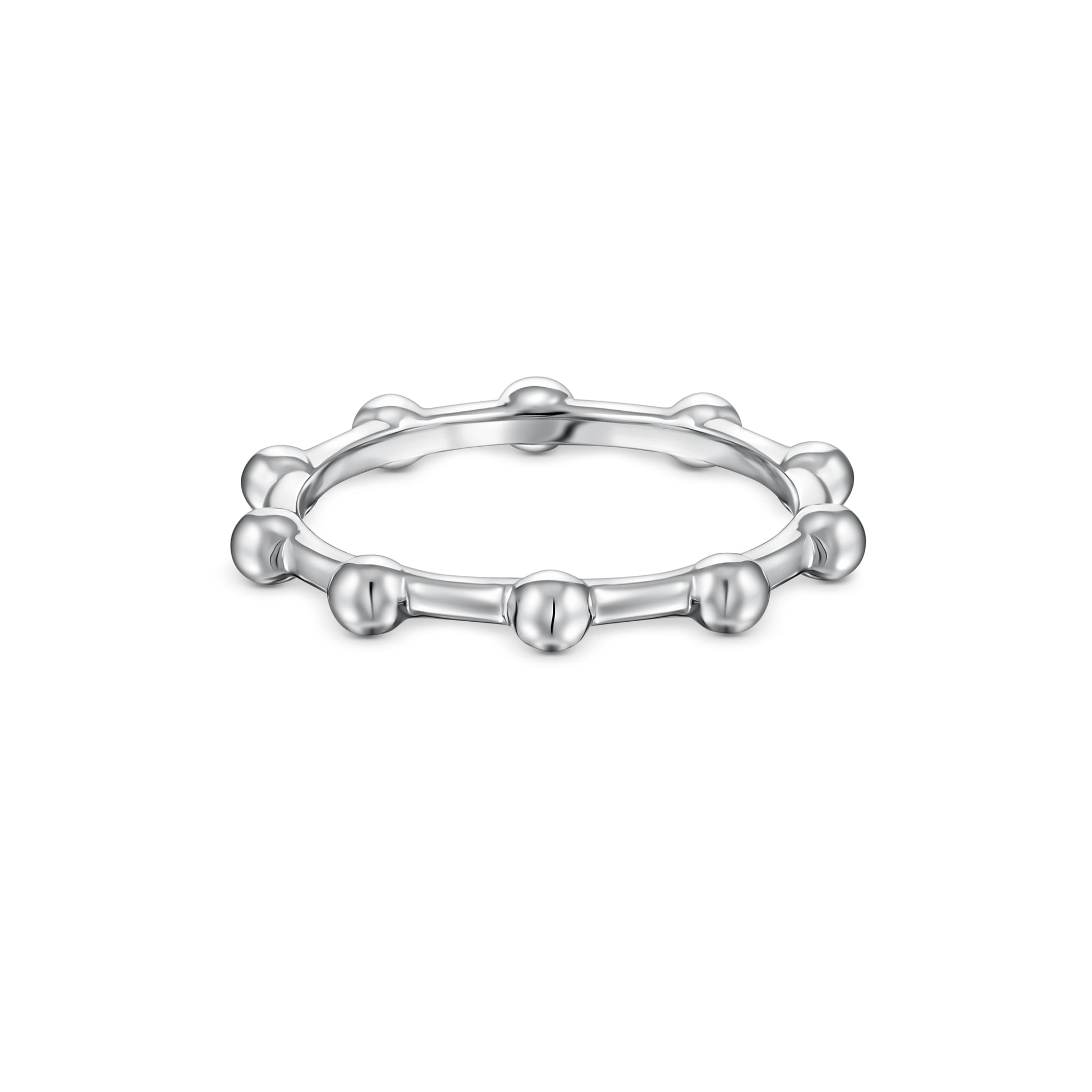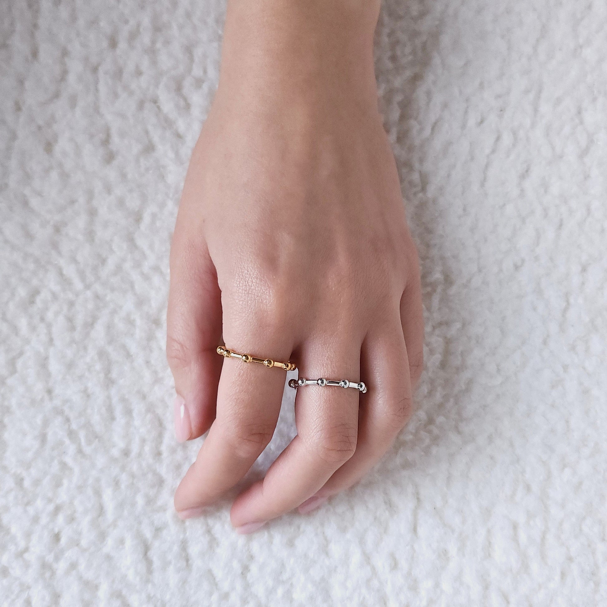 The Mini features fine, closely arranged beads for a delicate and subtle profile, perfect for stacking or minimalist looks.The Midi showcases larger, bolder beads encircling the entire band, offering a more sculptural and eye-catching silhouette.The Station alternates polished beads along a slender band, creating a light, airy rhythm with a modern twist.