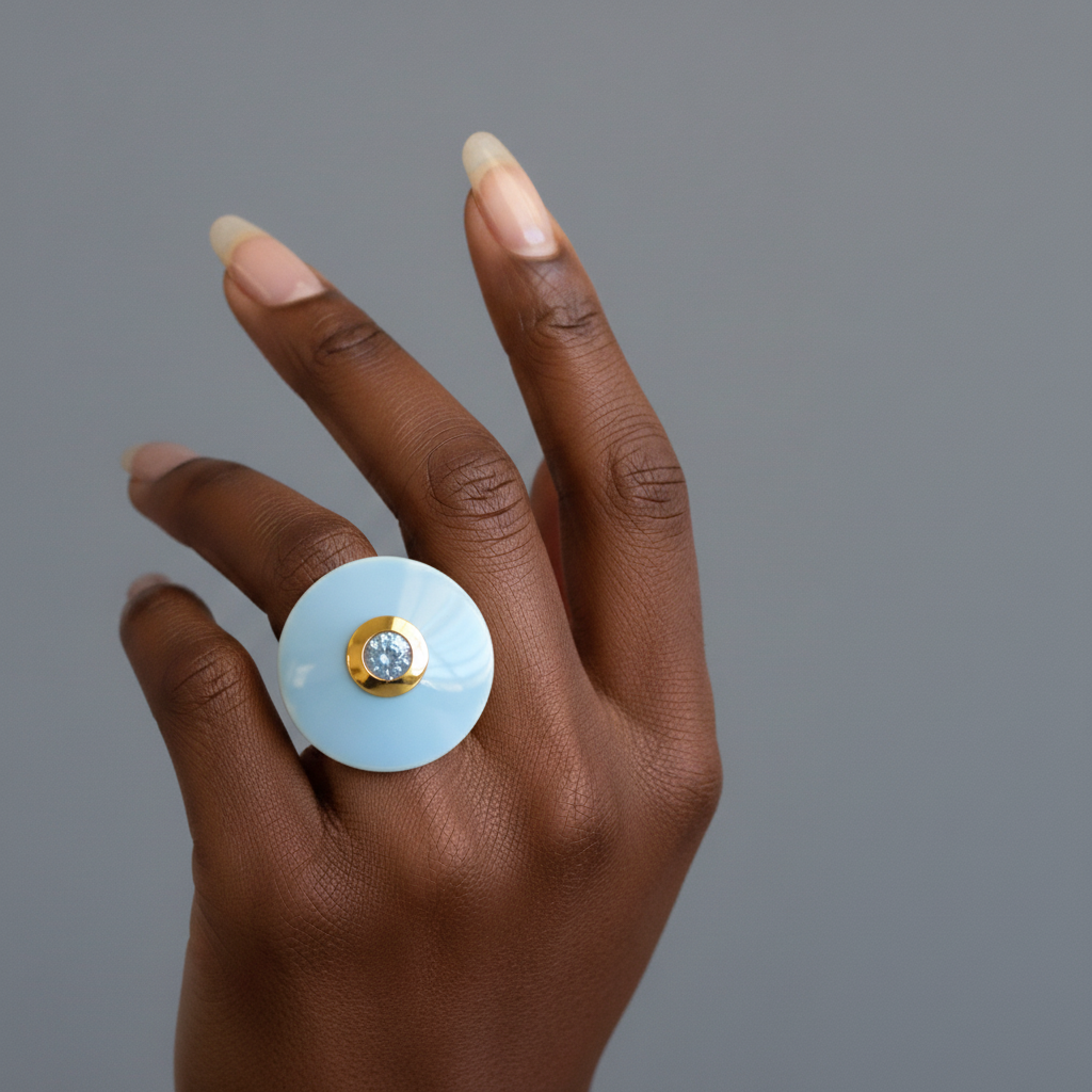 The Forma Alto Ring reinterprets the classic dome with a contemporary edge. Its gently elevated enamel form rises toward a luminous bezel-set 5 mm gemstone, creating a play of curve and reflection that feels architectural yet fluid. Designed to make a statement in any of Atlas Carré’s signature colours.
