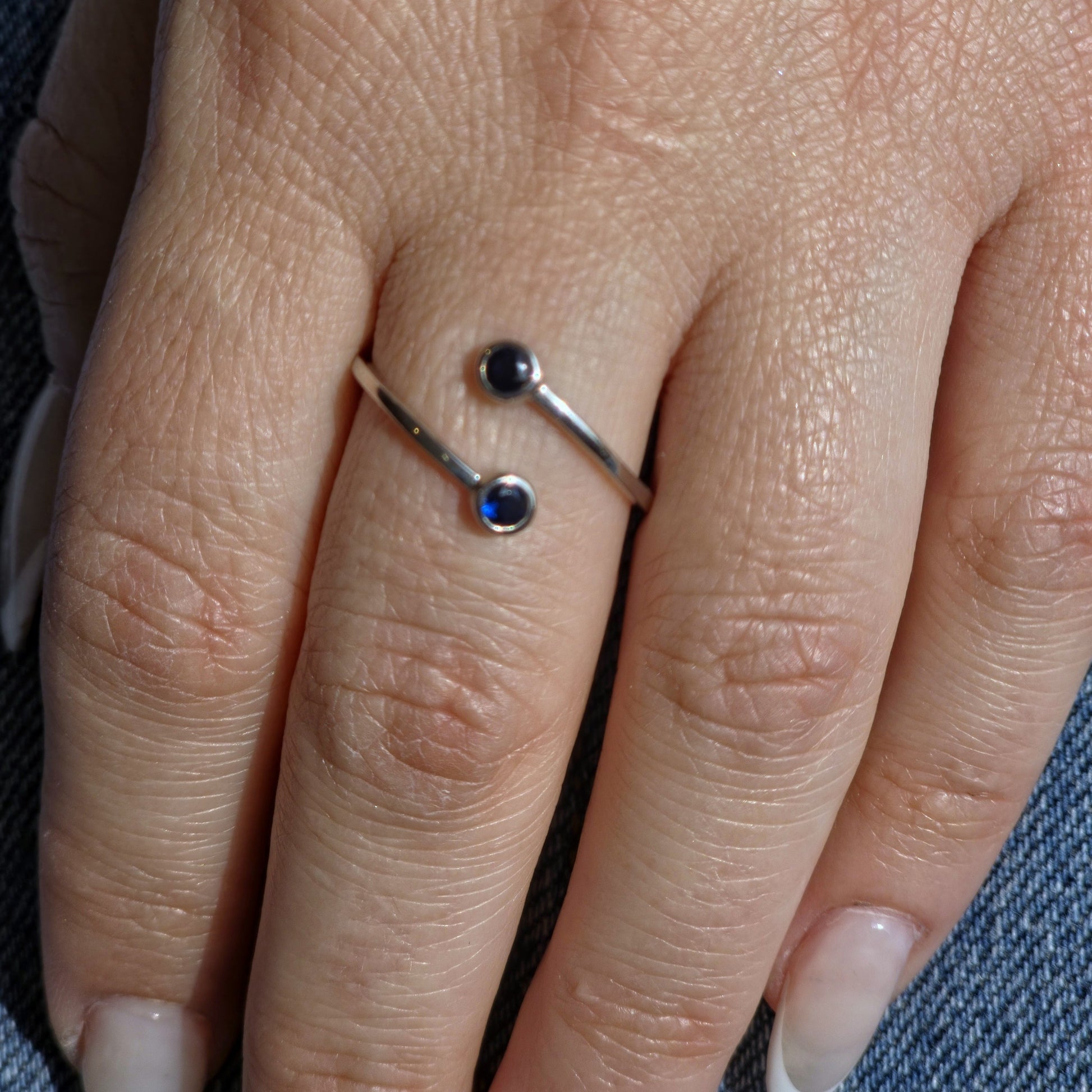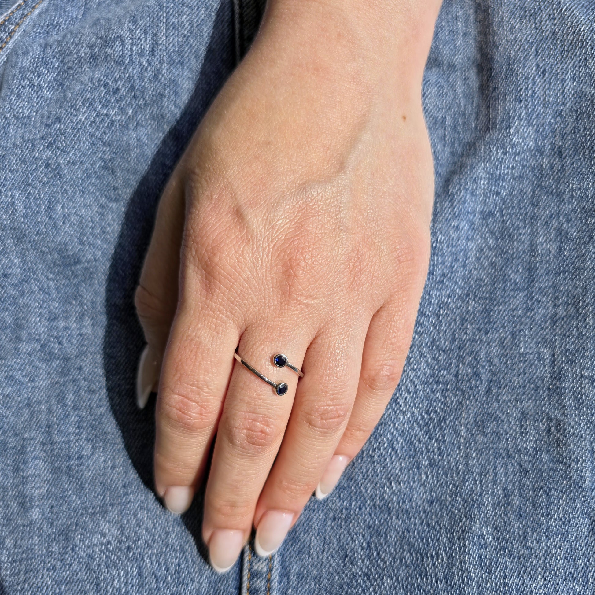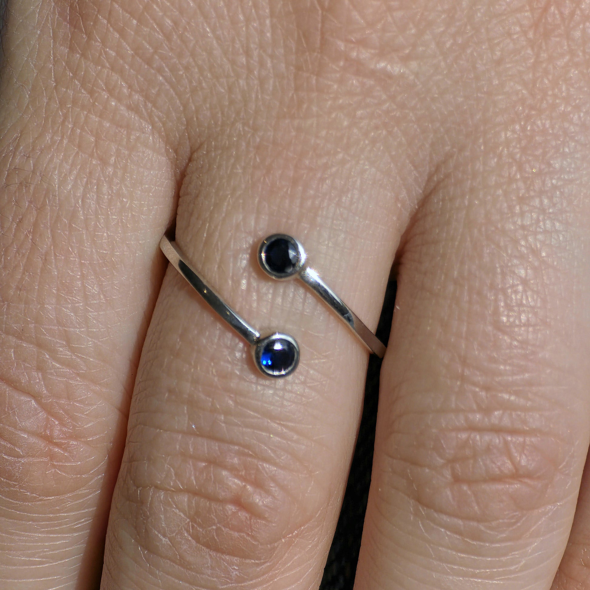 Minimalist bypass ring, featuring twin bezel set round gemstones
