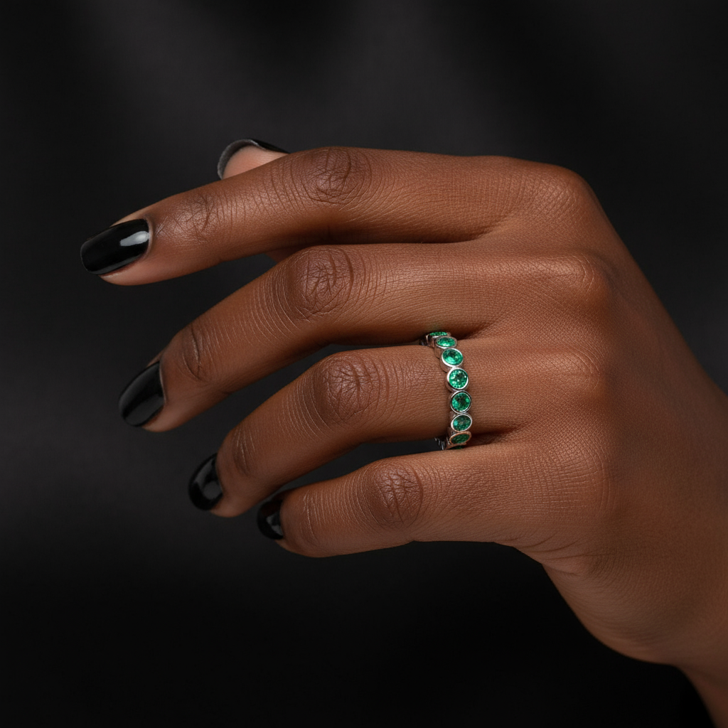 Sculptural bezel-set eternity band with a rhythmic, modern silhouette.