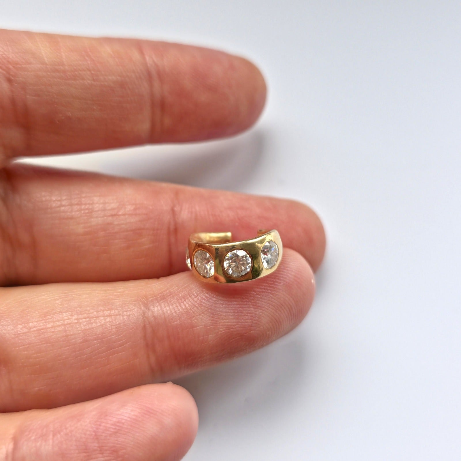 High-polish gold ear cuff with a bold curved silhouette and flush-set round gemstones.