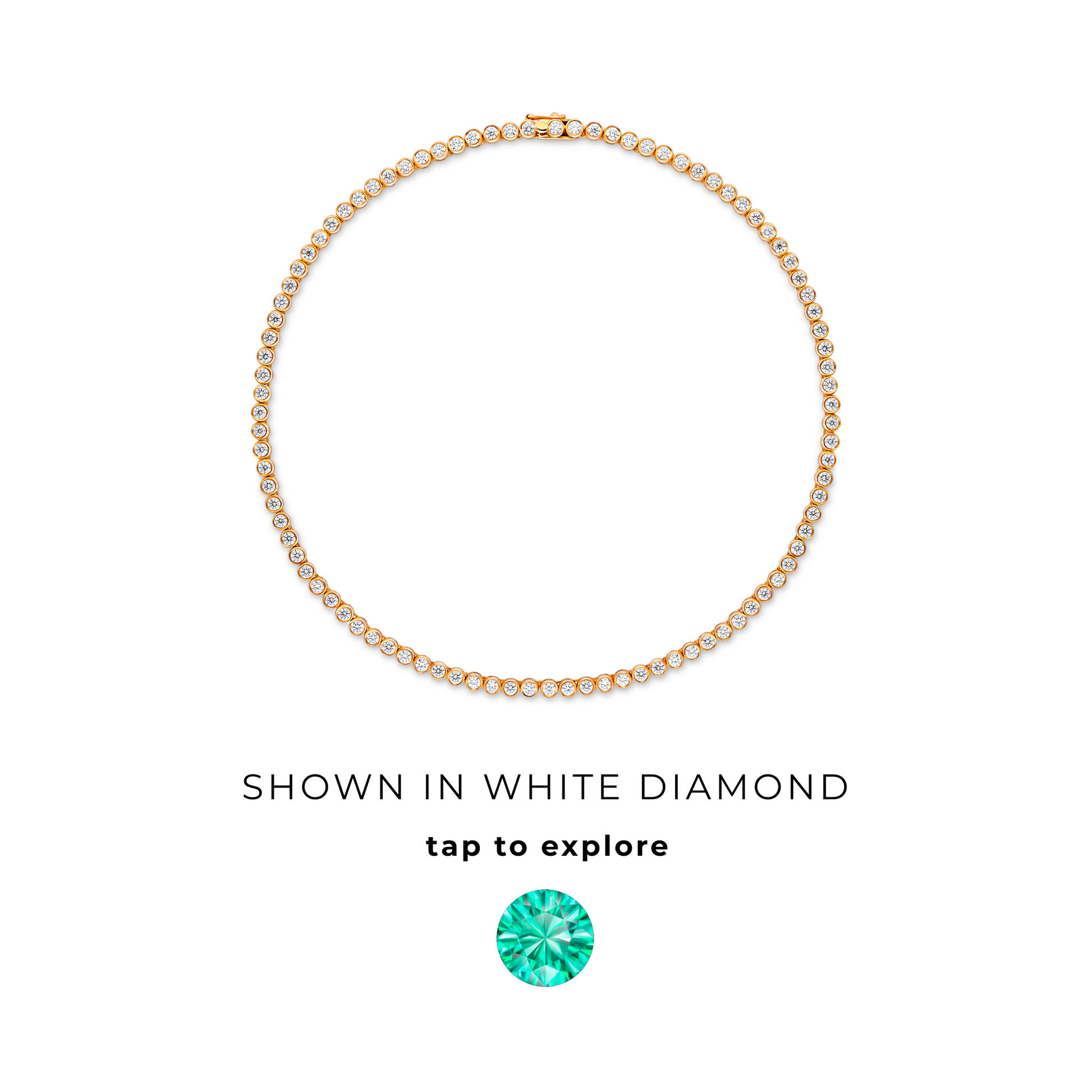 The Forma Tennis Necklace features a continuous row of bezel-set 3mm round gemstones in a clean, modern setting. Each stone is individually encased in gold, offering a smooth silhouette that balances structure with fluidity. A contemporary take on the classic tennis style, designed to sit comfortably around the neckline.