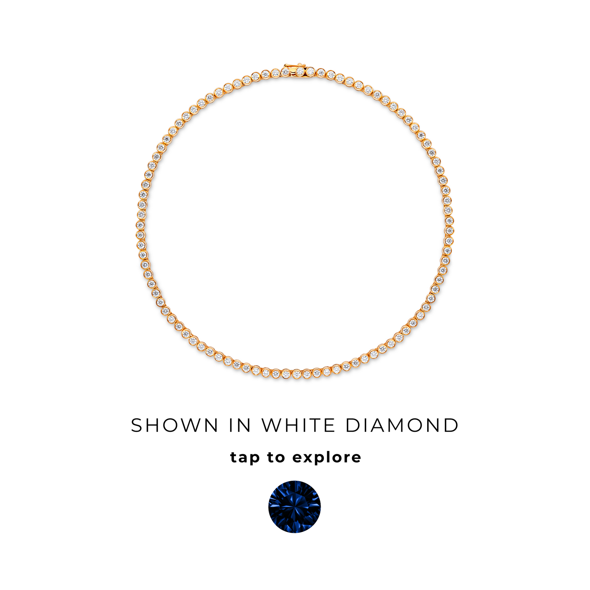 The Forma Tennis Necklace features a continuous row of bezel-set 3mm round gemstones in a clean, modern setting. Each stone is individually encased in gold, offering a smooth silhouette that balances structure with fluidity. A contemporary take on the classic tennis style, designed to sit comfortably around the neckline.