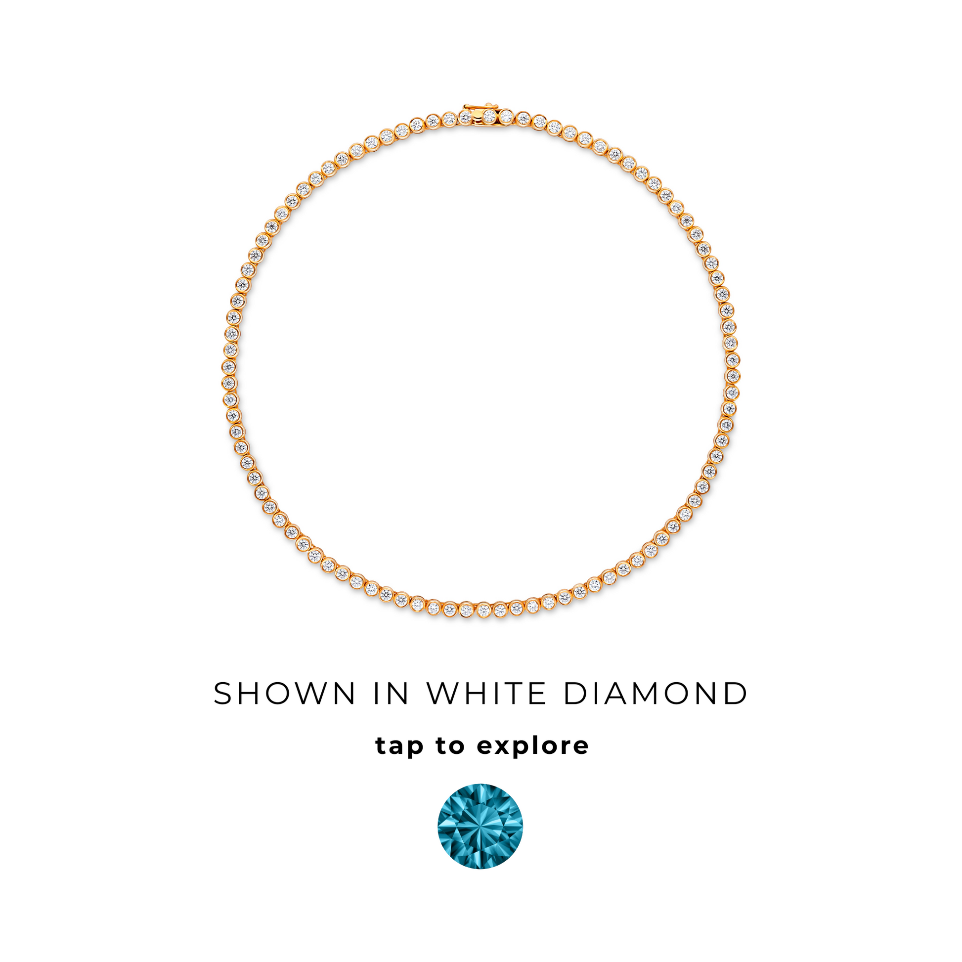 The Forma Tennis Necklace features a continuous row of bezel-set 3mm round gemstones in a clean, modern setting. Each stone is individually encased in gold, offering a smooth silhouette that balances structure with fluidity. A contemporary take on the classic tennis style, designed to sit comfortably around the neckline.