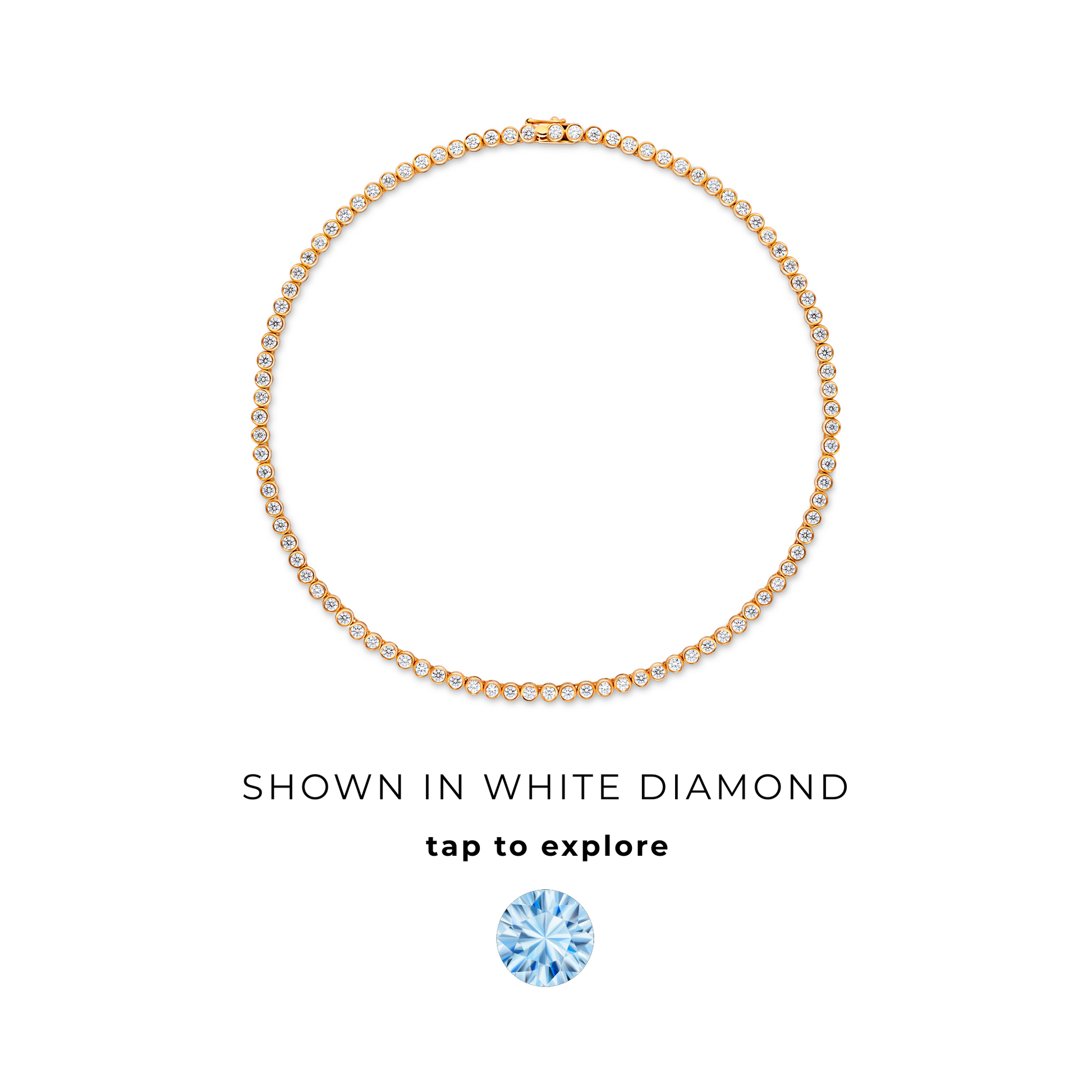The Forma Tennis Necklace features a continuous row of bezel-set 3mm round gemstones in a clean, modern setting. Each stone is individually encased in gold, offering a smooth silhouette that balances structure with fluidity. A contemporary take on the classic tennis style, designed to sit comfortably around the neckline.