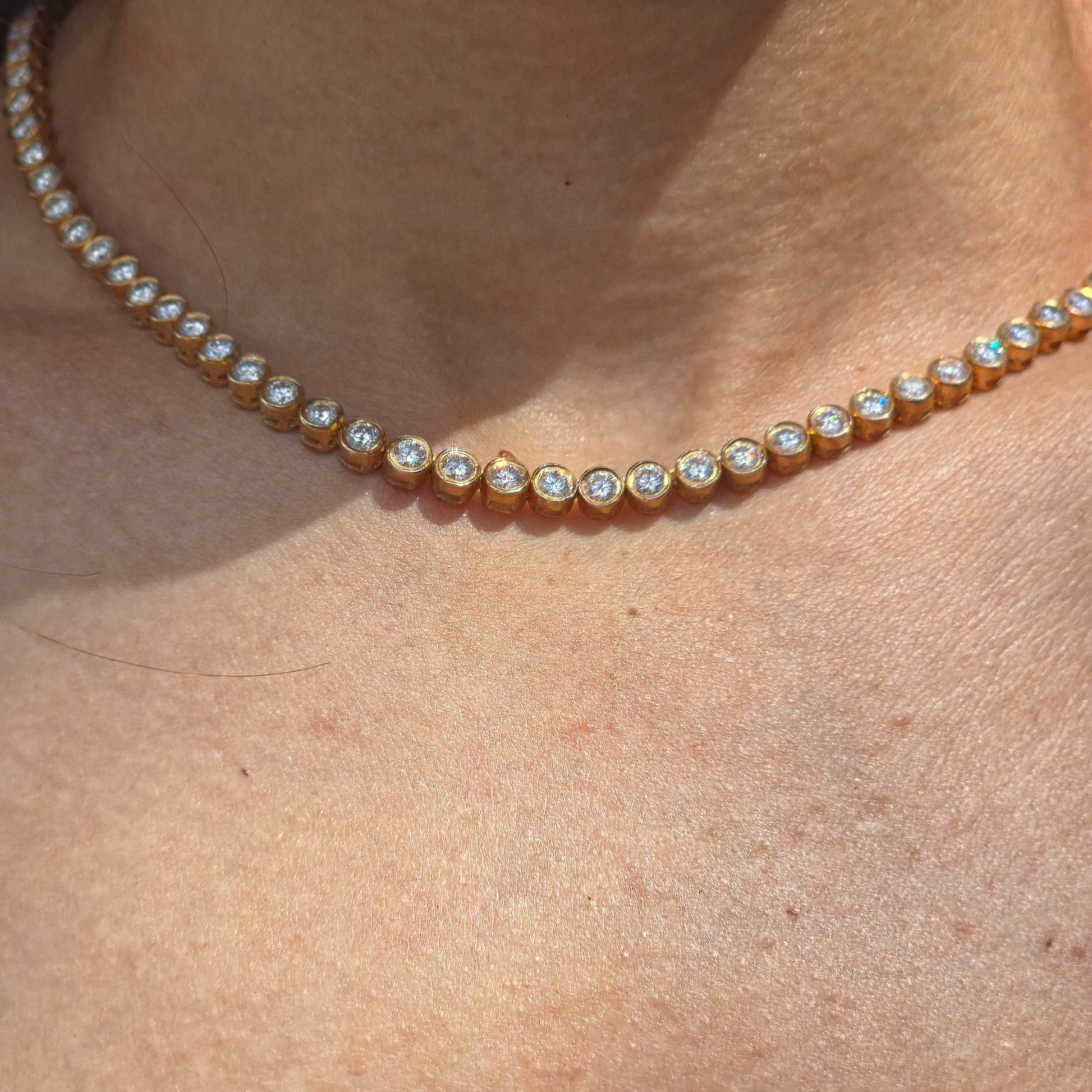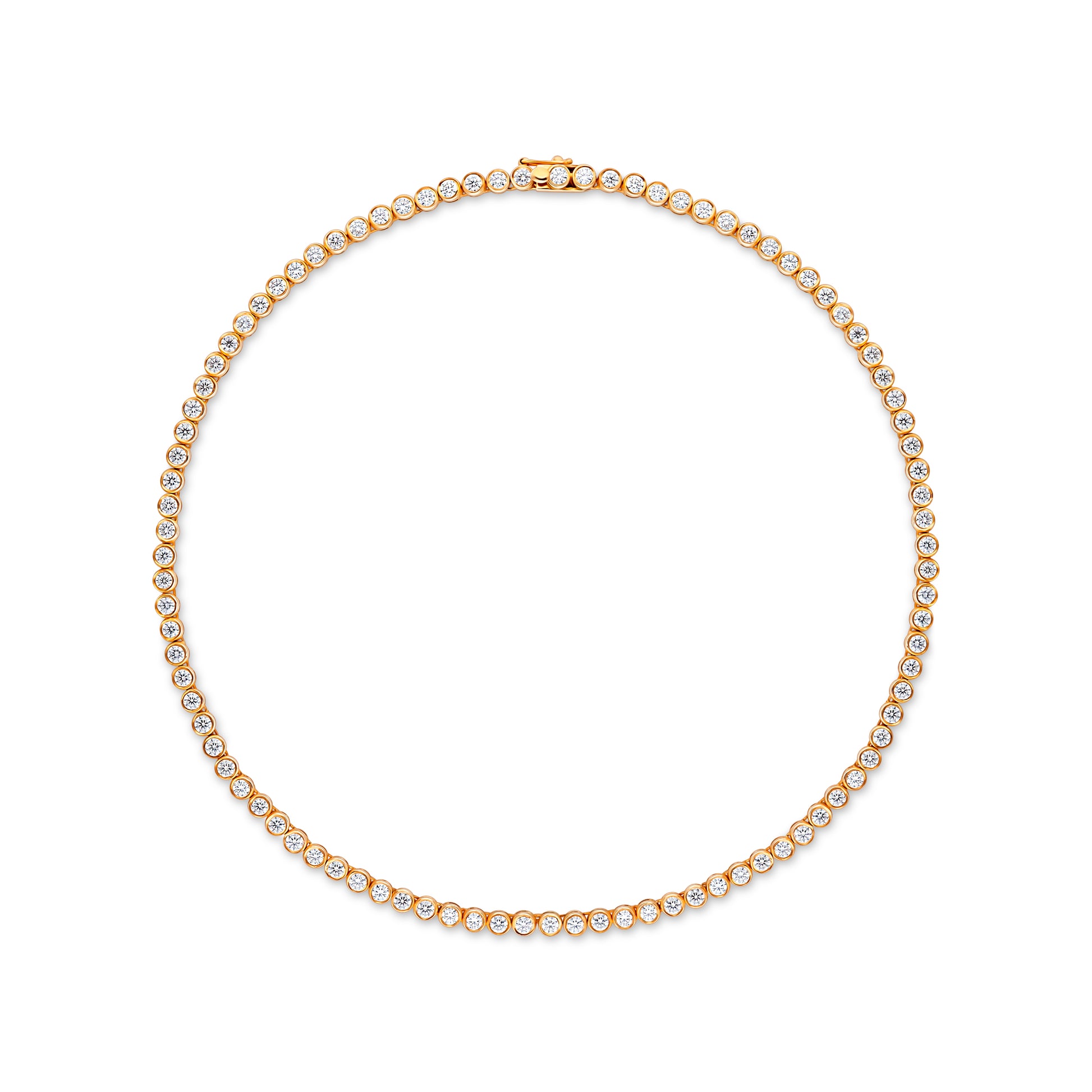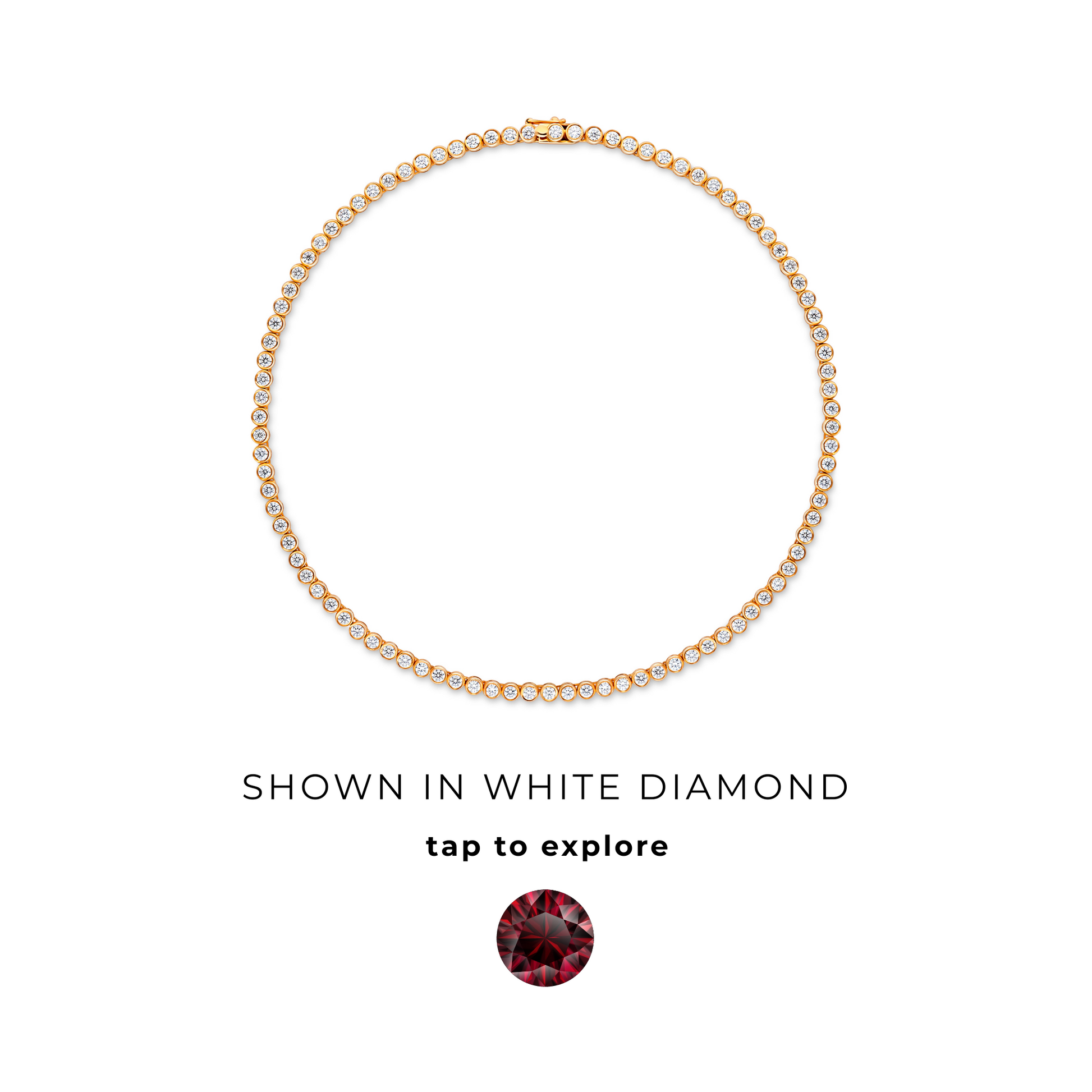 The Forma Tennis Necklace features a continuous row of bezel-set 3mm round gemstones in a clean, modern setting. Each stone is individually encased in gold, offering a smooth silhouette that balances structure with fluidity. A contemporary take on the classic tennis style, designed to sit comfortably around the neckline.