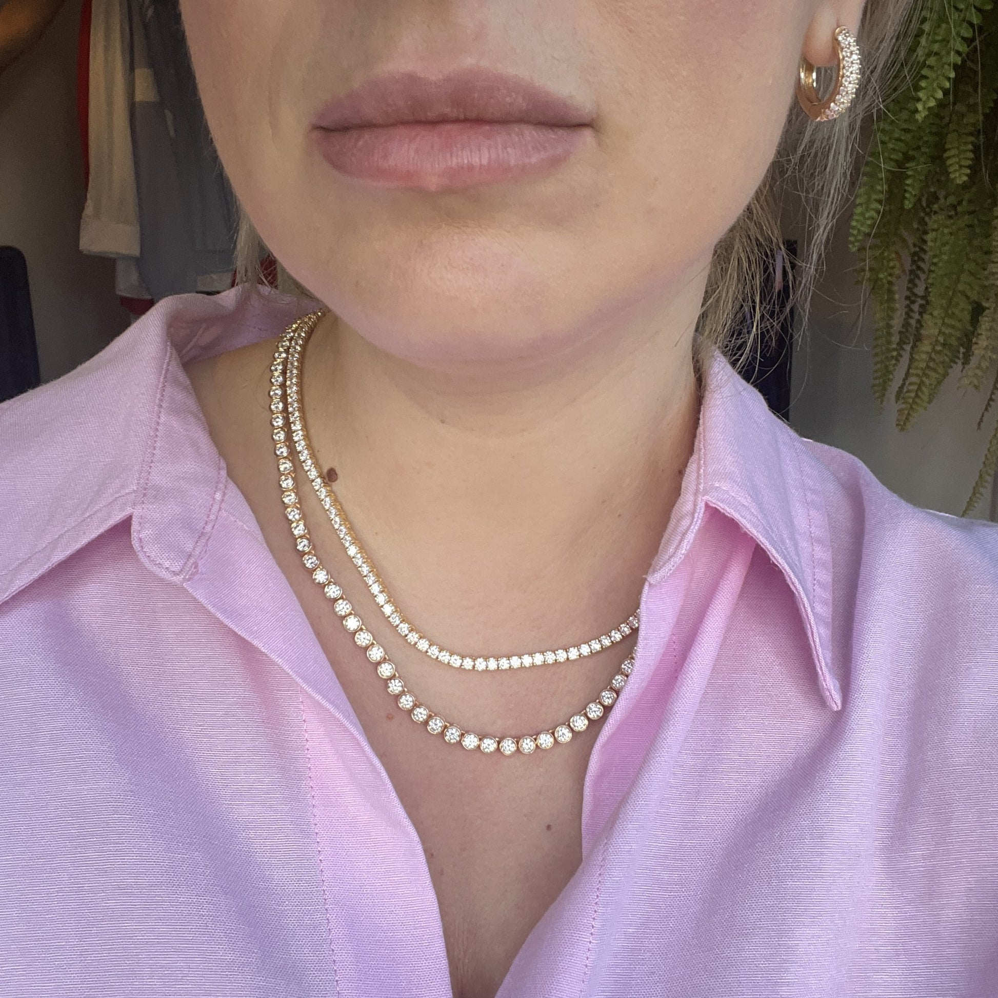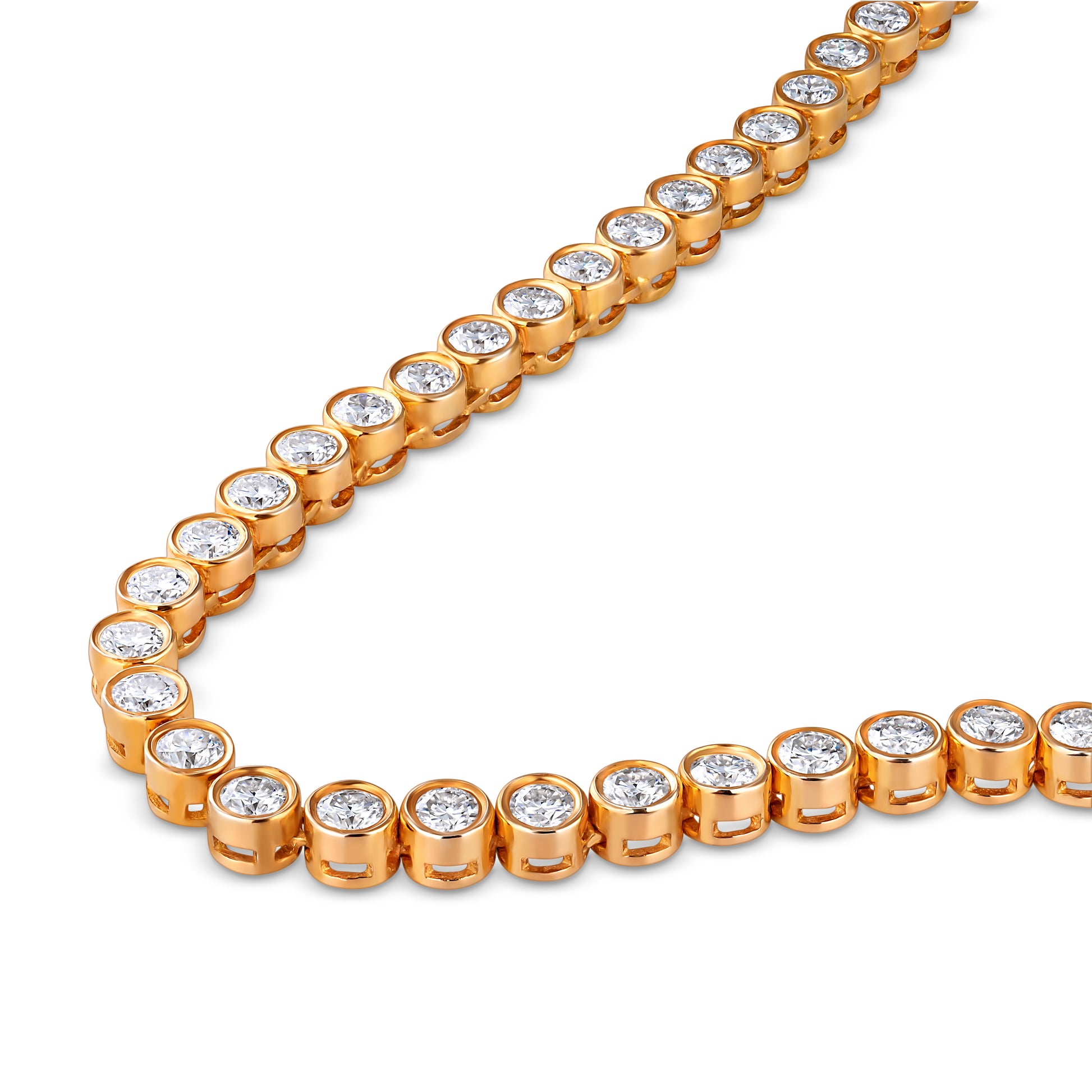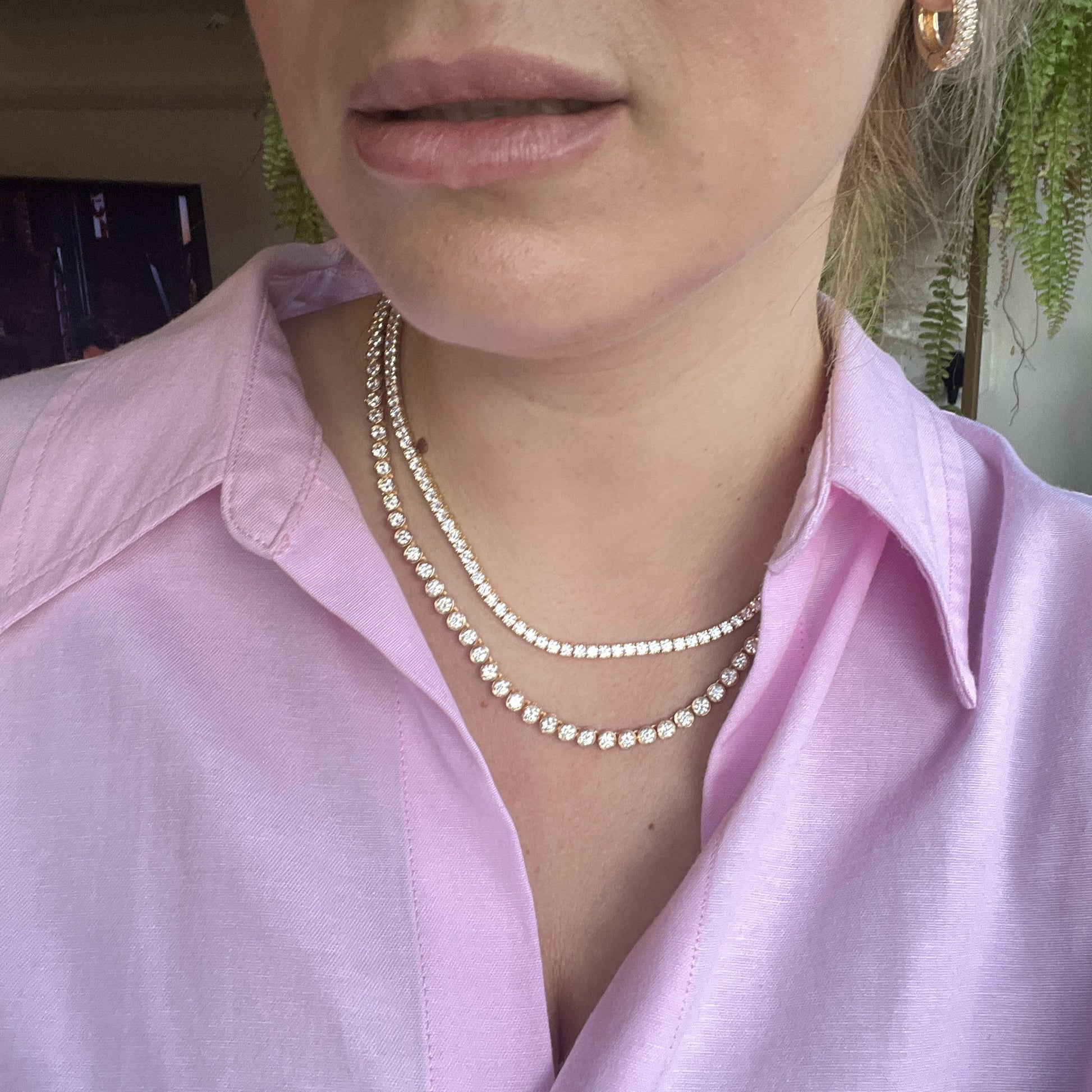 The Forma Tennis Necklace features a continuous row of bezel-set 3mm round gemstones in a clean, modern setting. Each stone is individually encased in gold, offering a smooth silhouette that balances structure with fluidity. A contemporary take on the classic tennis style, designed to sit comfortably around the neckline.