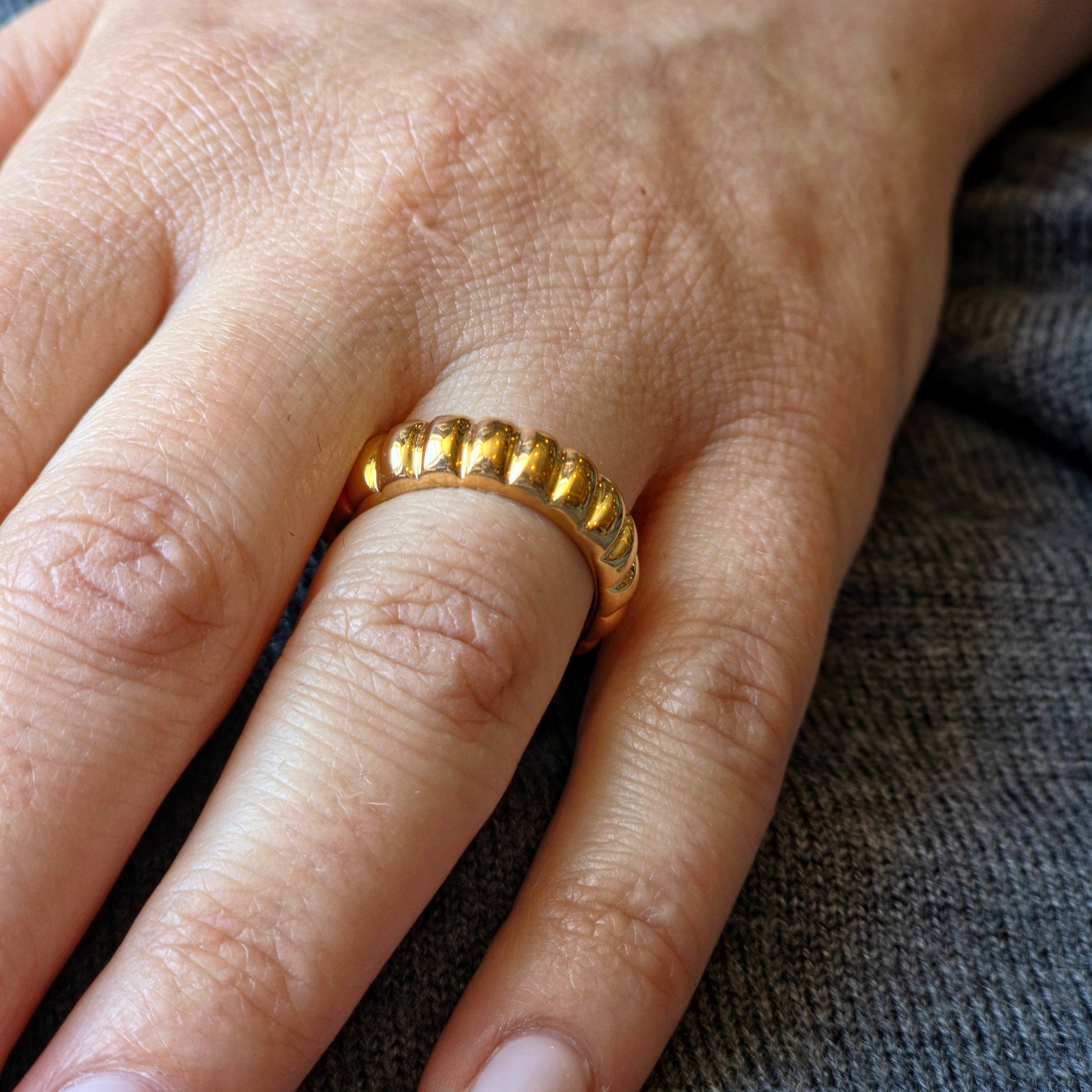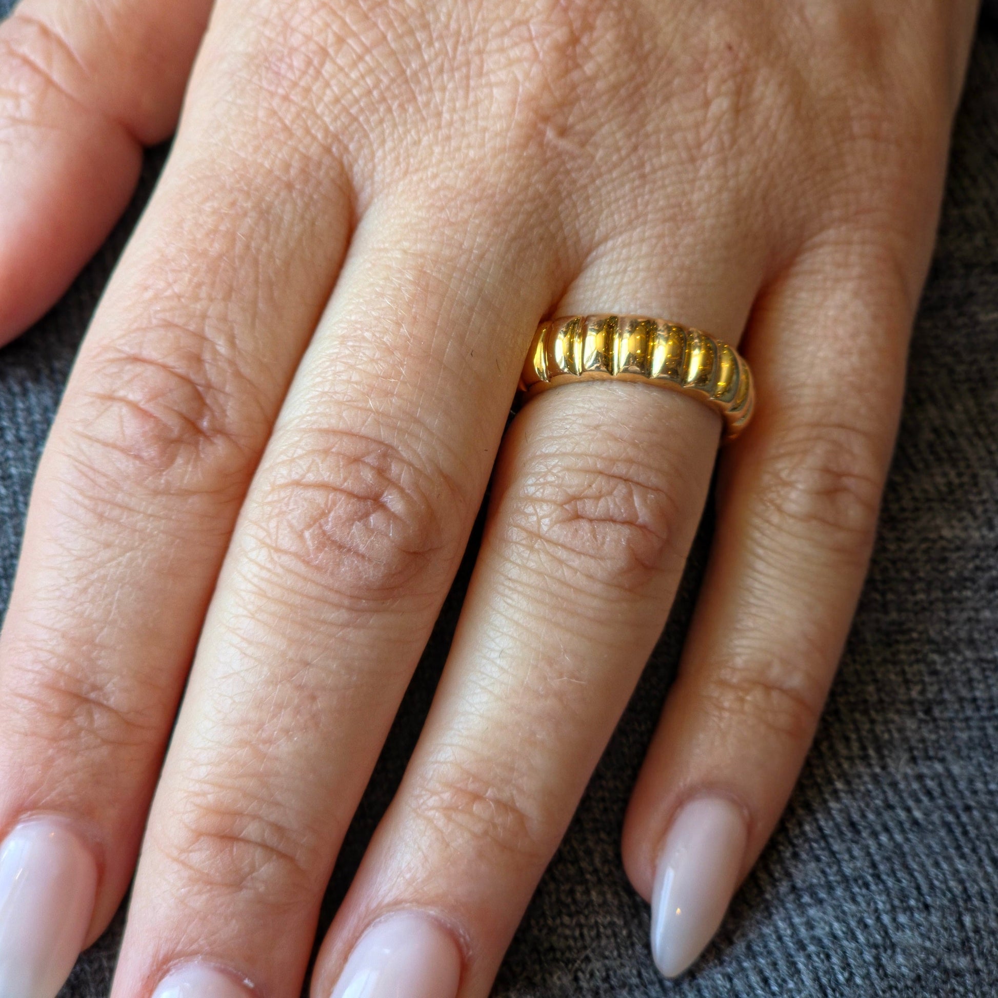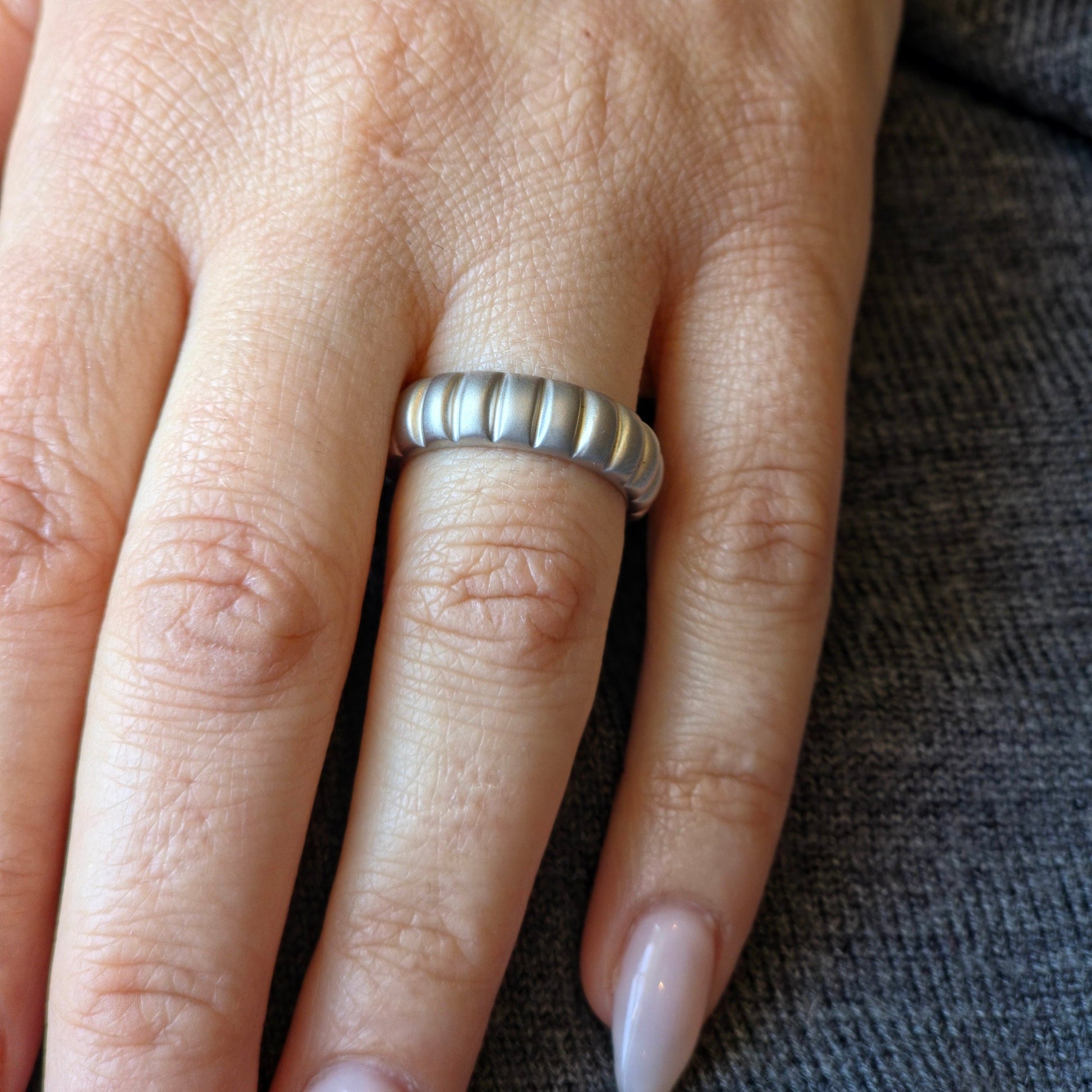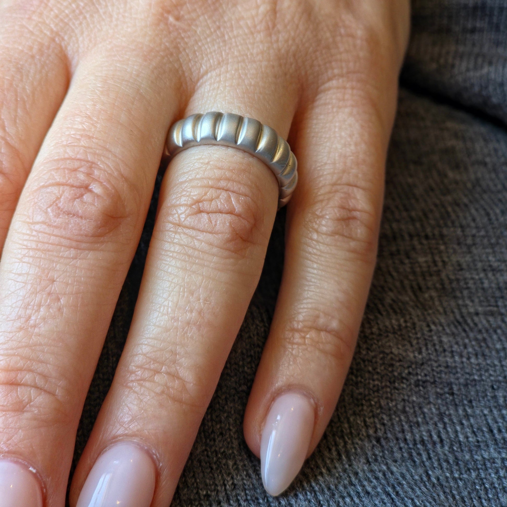 A softly rounded band with segmented ridges - tactile, minimal, and stack-friendly