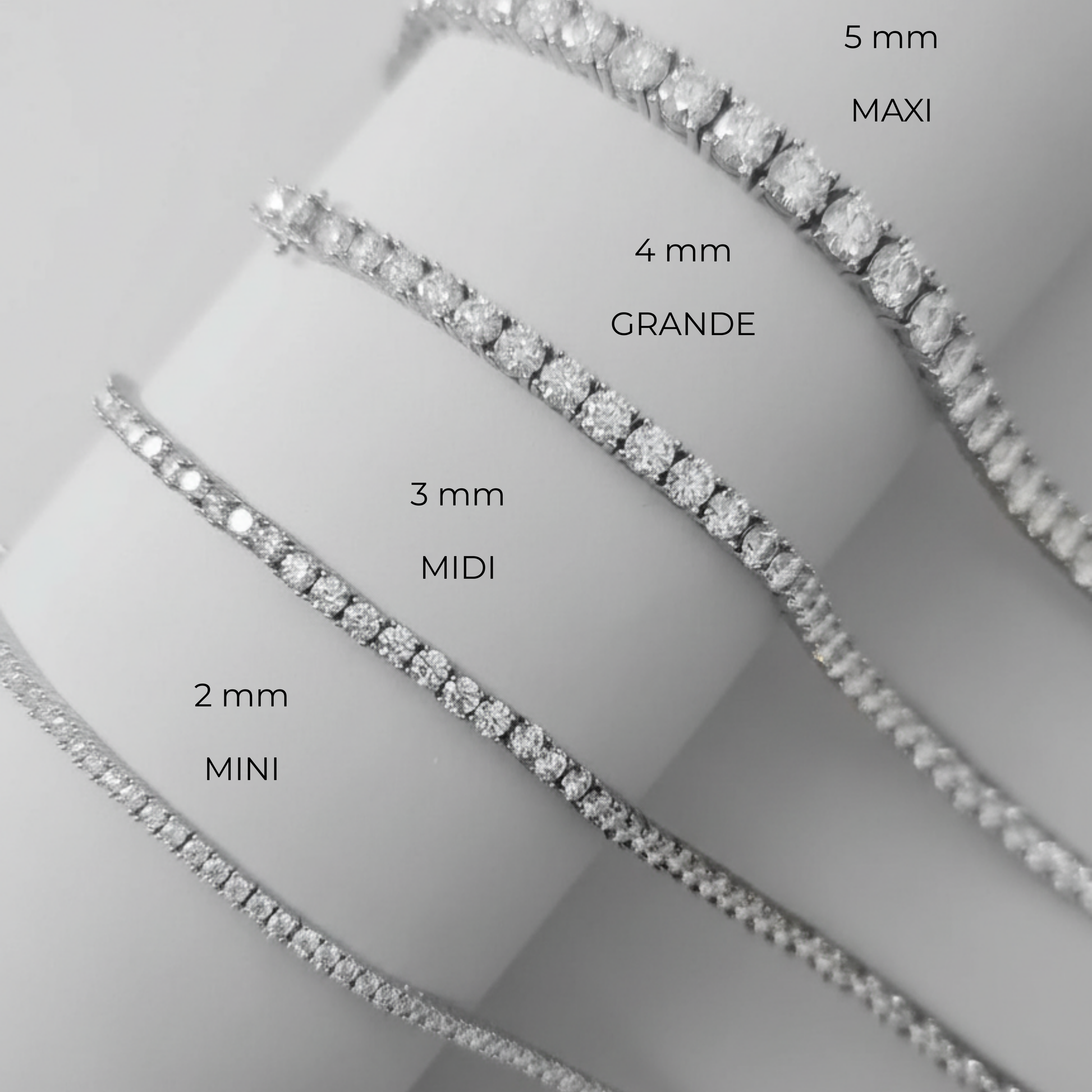 From subtle shimmer to show-stopping brilliance, the Juno Tennis Necklace is available in five distinctive styles - each designed to suit a different mood, moment, or personal expression. The Mini (2 mm) offers a whisper of light, perfect for layering or everyday delicacy. The Midi (3 mm) brings a touch more glow, effortlessly refined for daily wear. The Grande (4 mm) introduces a bolder presence - polished and timeless with undeniable charm. The Maxi (5 mm) is an unapologetic statement, radiating opulence with every facet. For a dynamic take, the Graduated version flows gracefully from 2.5 to 5 mm stones, sculpting the neckline with elegant dimension. Whether worn alone or stacked, each necklace captures the essence of modern heirloom design. Standard length: 40 cm (approx. 16”). Available in all Atlas Carré signature colours.