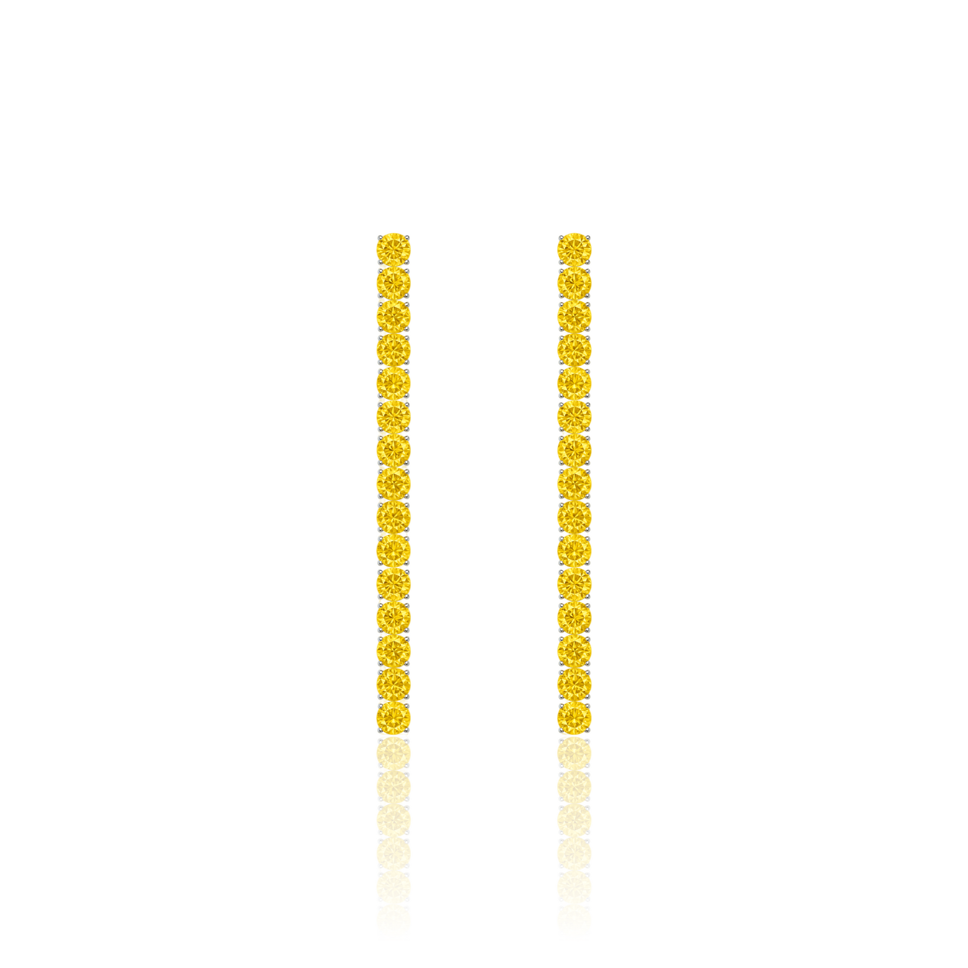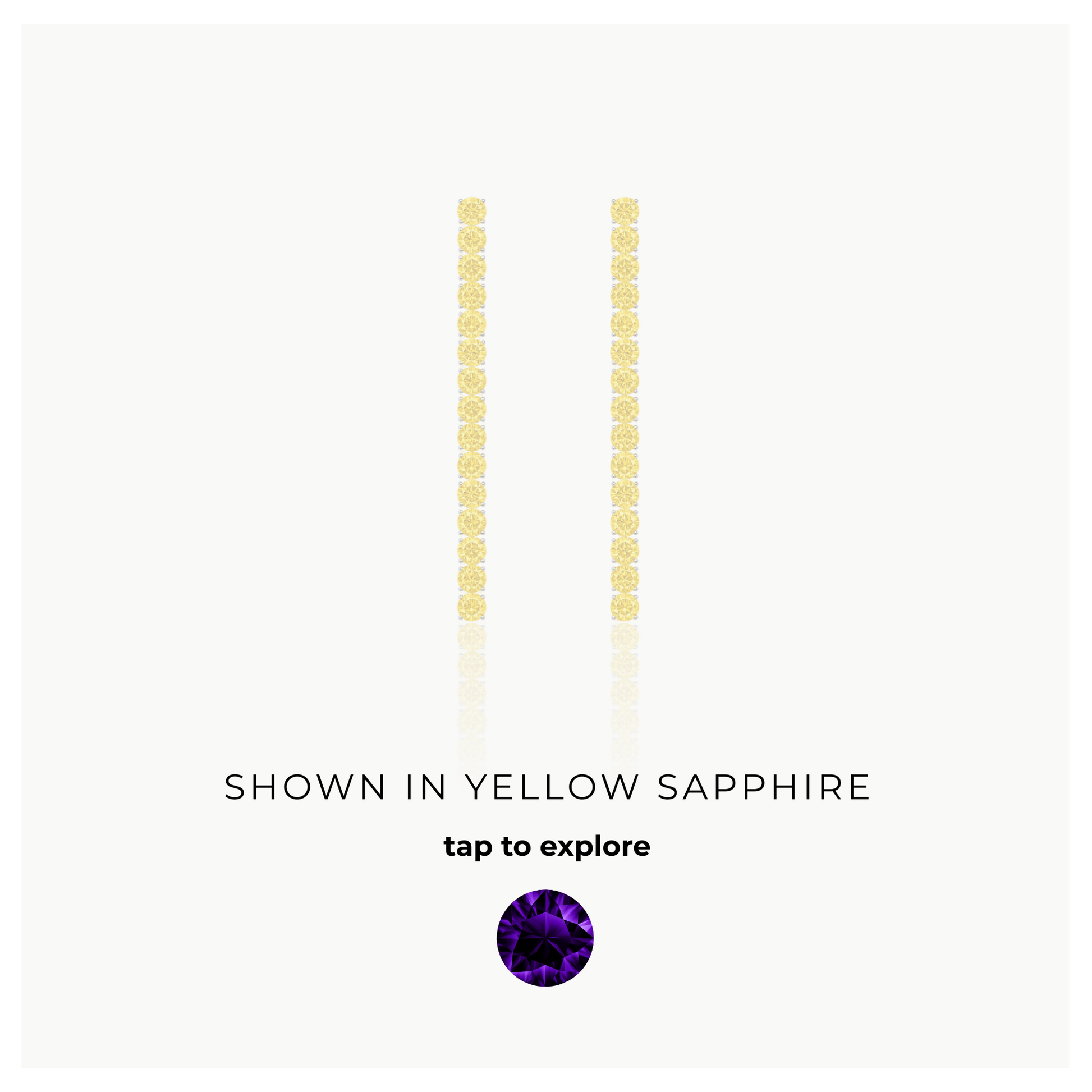 "Classic, mid-length drop earrings with uniform round gemstones, prong-set "