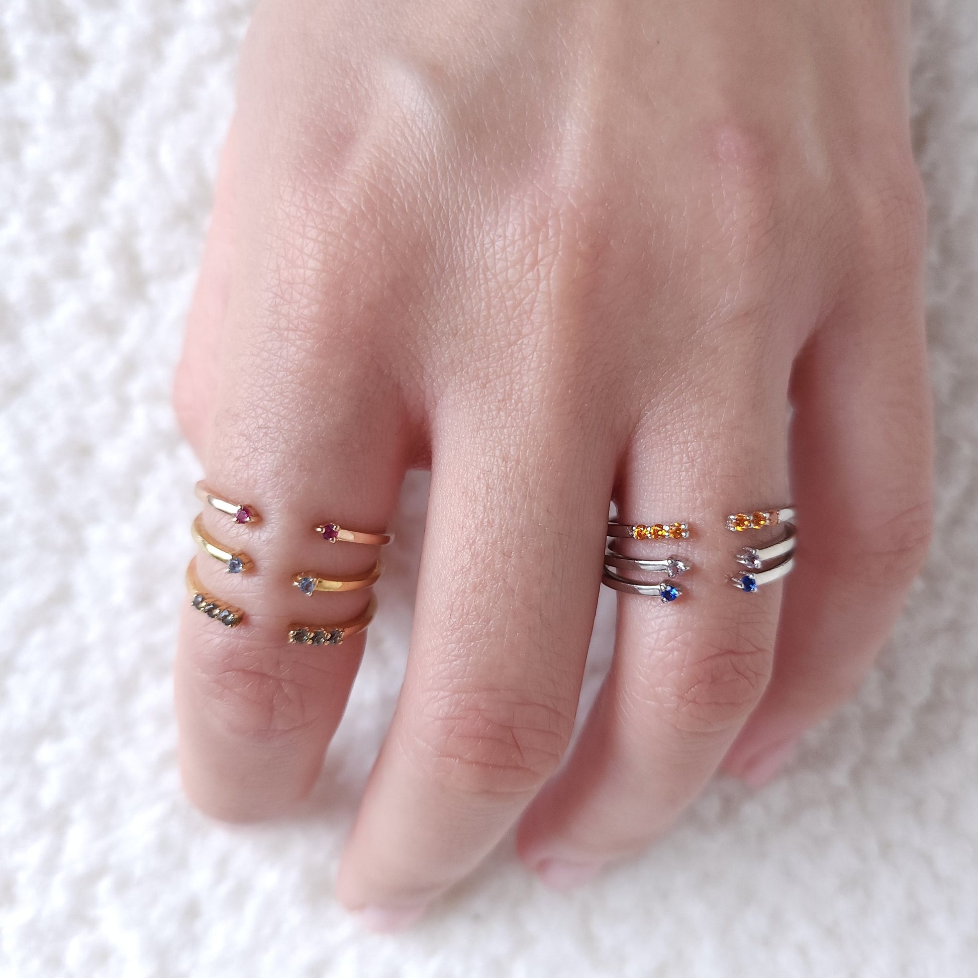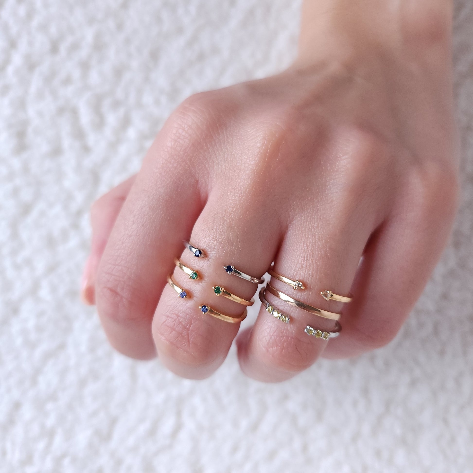 An open cuff, minimalist, stackable ring, with prong set gemstones