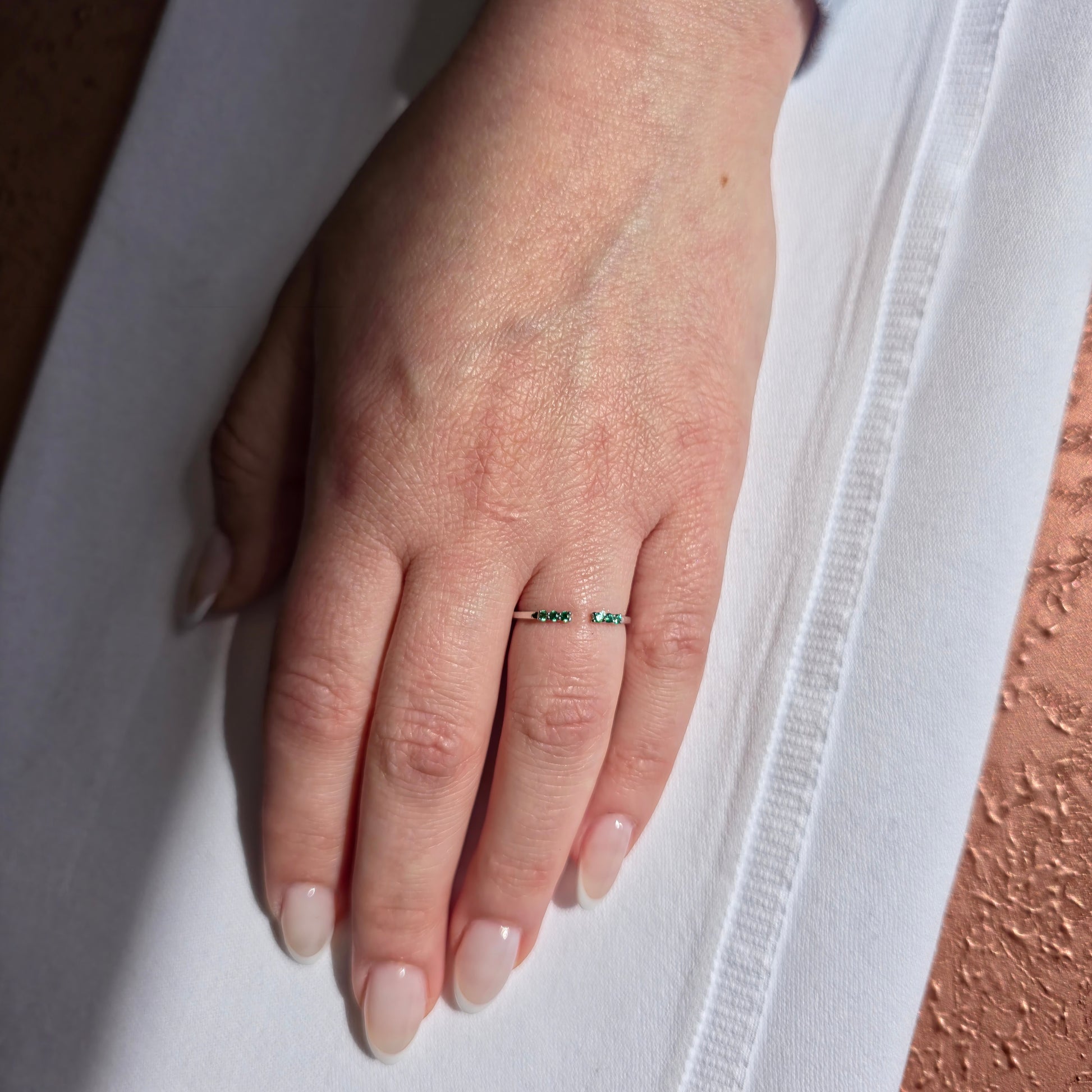 The Linea Tres Ring is a refined and versatile piece featuring 6 x 1.5 mm gemstones (3 each side) prong-set in gold, offering a vibrant pop of colour. Its slim design makes it perfect for stacking, allowing you to create unique combinations or add a touch of brilliance to your ring stack. It can also be used to frame your engagement ring or other solitaire ring, bringing a bit of colour to your finger, but not overpowering the main ring. This ring is available in all Atlas Carré signature colours.