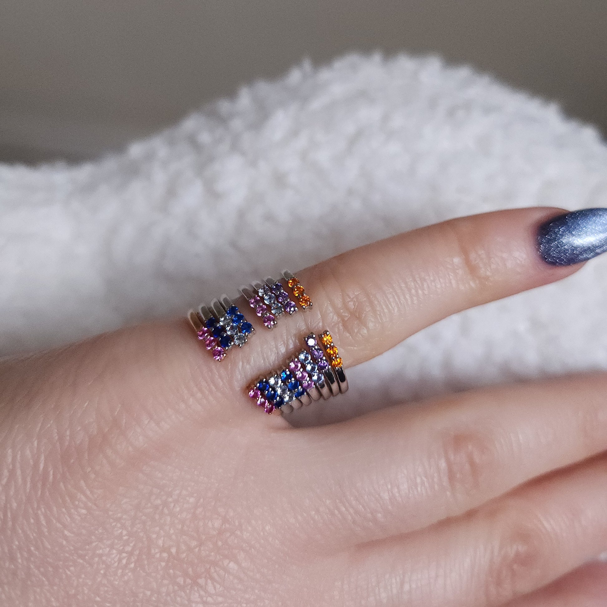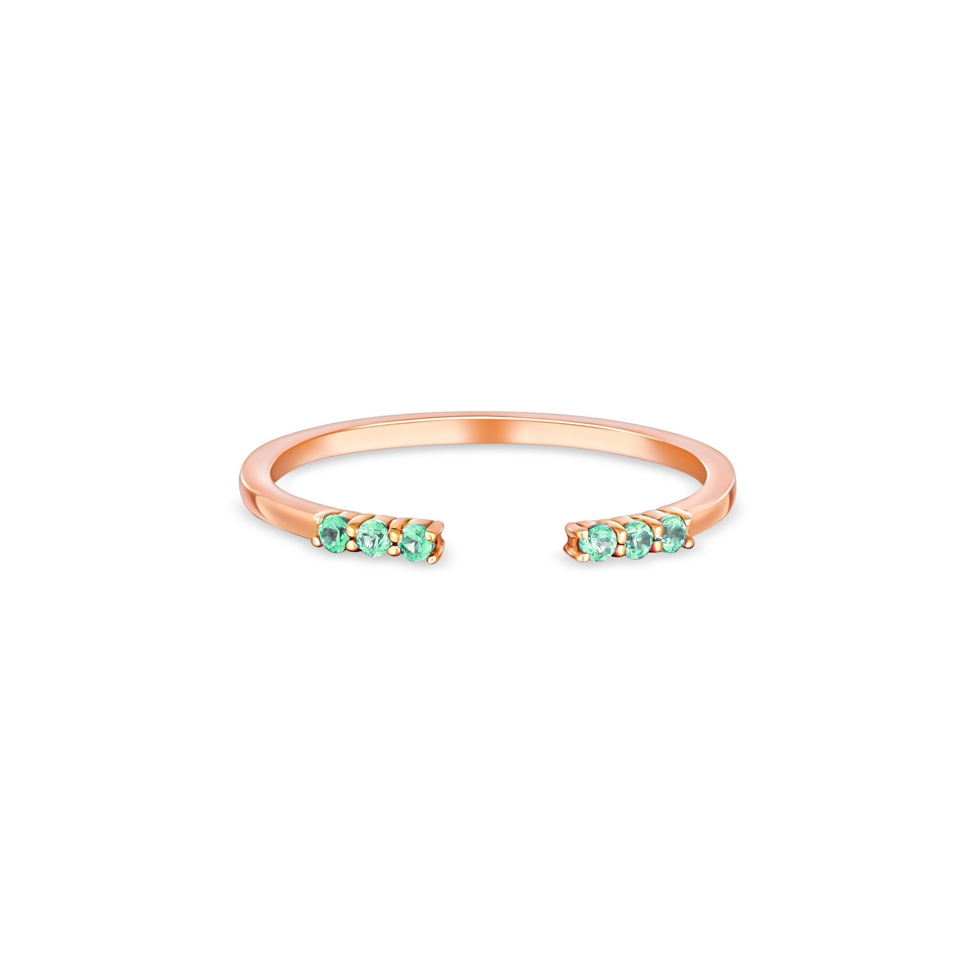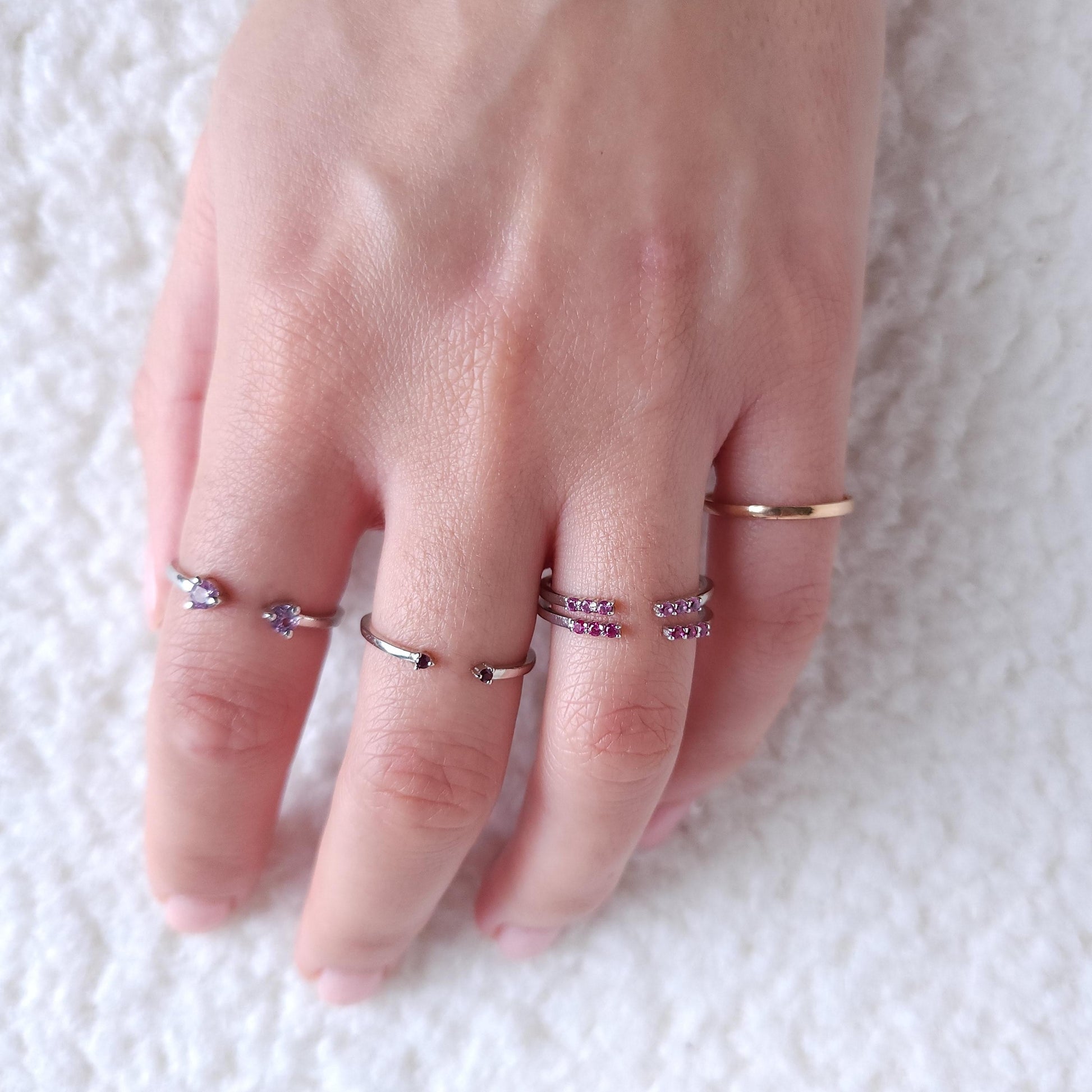 An open cuff, minimalist, stackable ring, with prong set gemstones