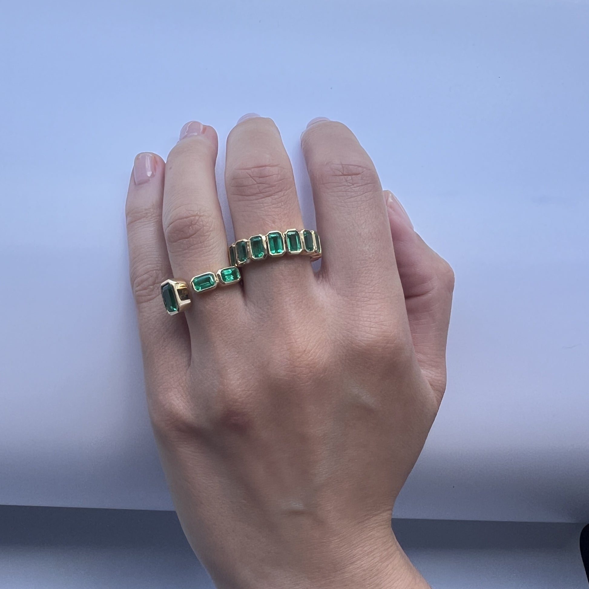 Asymmetric open ring with bezel-set emerald cut gemstones in a balanced geometric design