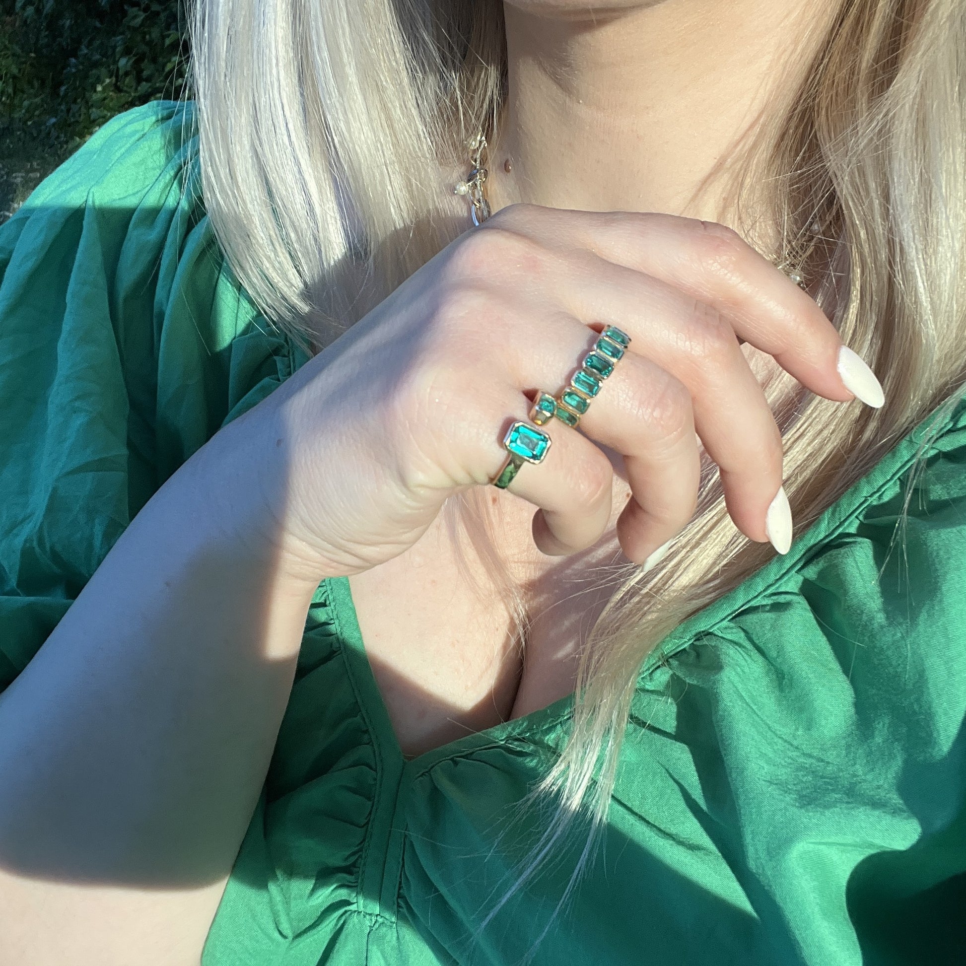 The Nexus Frame Open Ring brings clarity and intention to asymmetric design. One side features a bold emerald cut gemstone in a clean bezel setting; the other is mirrored by two smaller emerald cut stones set side by side. The result is a quiet study in proportion, harmony, and modern refinement. Available in all Atlas Carré signature colors.