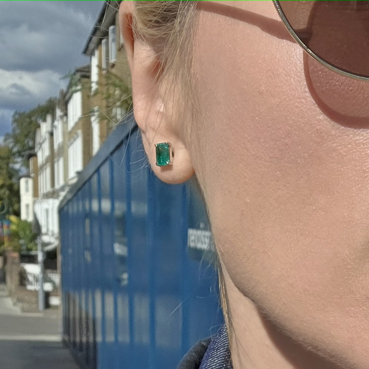 The Nexus Stud Earrings feature emerald cut gemstones set in a classic 4 prong setting for a clean, modern look. Available in two sizes: Mini with 4x6 mm stones for a subtle, minimalist style, and Grande with 5x7 mm stones for a more noticeable everyday statement. Designed to sit flush against the ear and stack effortlessly with other earrings or drops or wear alone.
