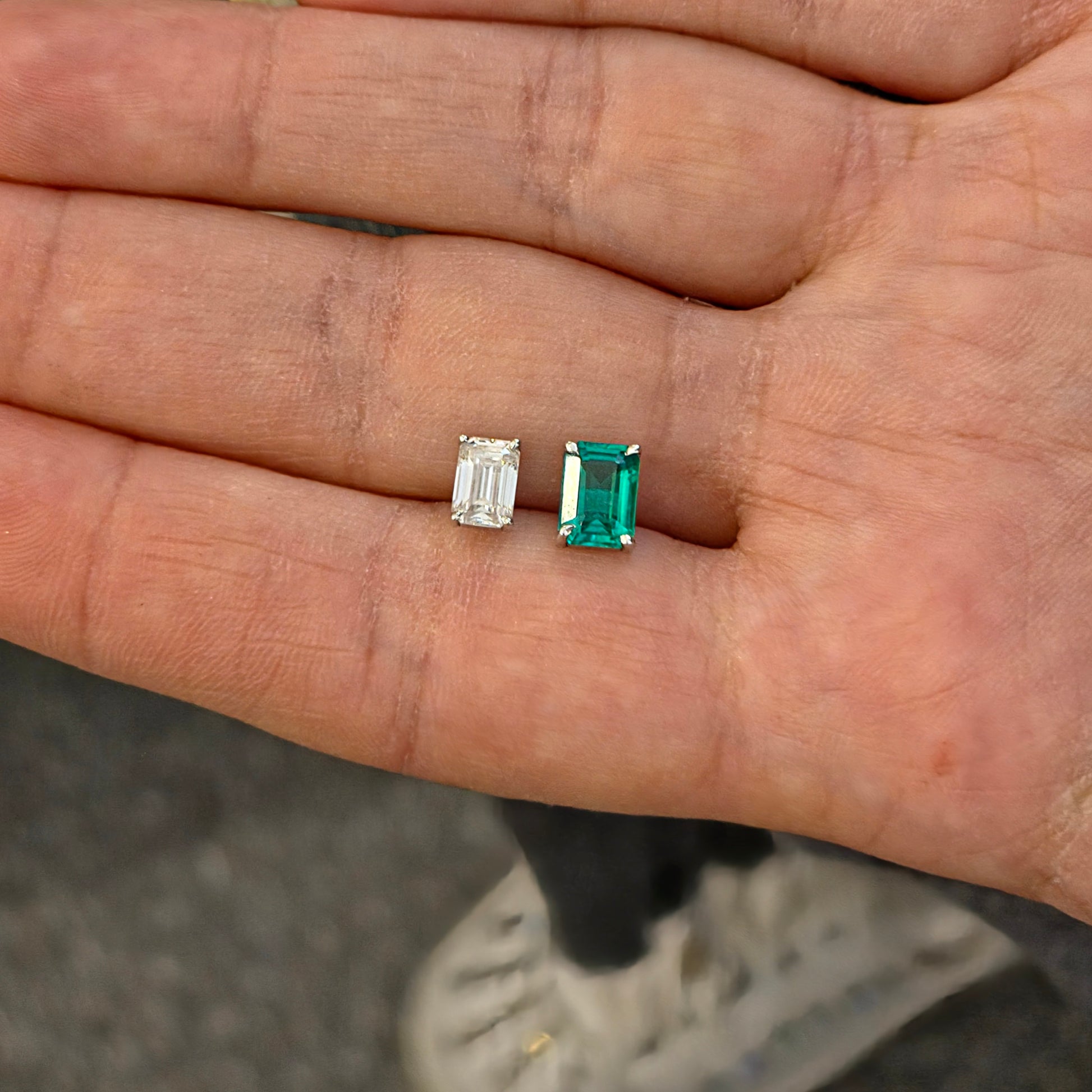 The Nexus Stud Earrings feature emerald cut gemstones set in a classic 4 prong setting for a clean, modern look. Available in two sizes: Mini with 4x6 mm stones for a subtle, minimalist style, and Grande with 5x7 mm stones for a more noticeable everyday statement. Designed to sit flush against the ear and stack effortlessly with other earrings or drops or wear alone.