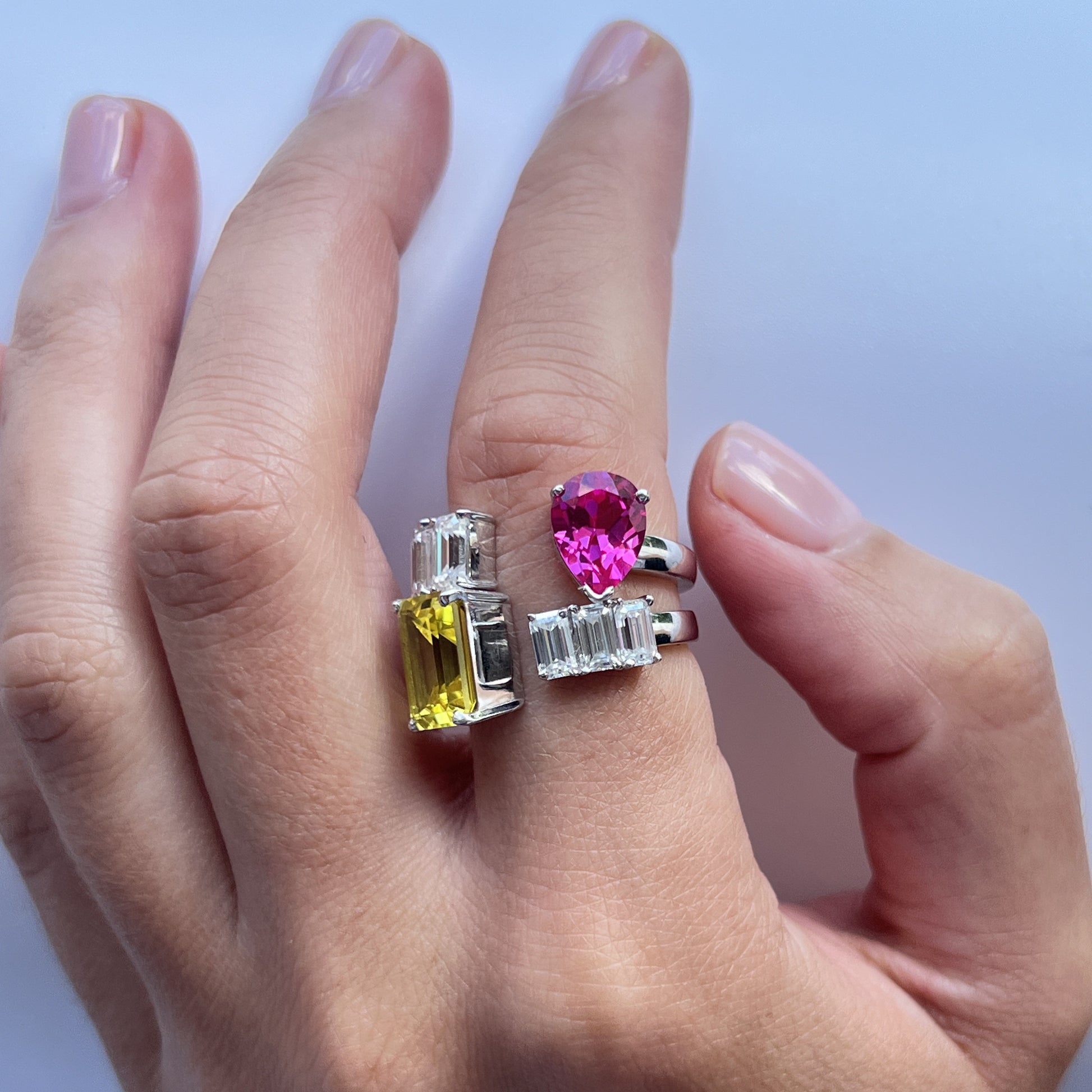The Nexus Open Ring plays with proportion and negative space in a sculptural open design. One side features a striking emerald cut gemstone, while the other is set with a linear trio of matching emerald cut diamonds. The result is a bold yet balanced composition - crisp, architectural, and unmistakably modern. Available in all Atlas Carré signature colors.