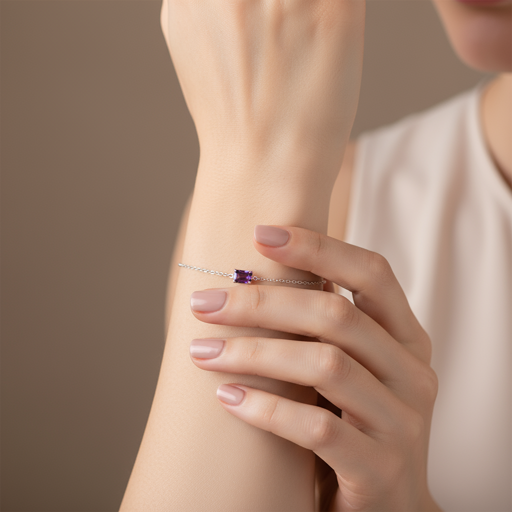 The Nexus Solitaire Bracelet features a luminous emerald cut gemstone secured in a classic four-prong setting and linked to a fine, minimal chain. Refined and versatile, it adds a subtle touch of brilliance to any stack or stands alone as a quiet statement.