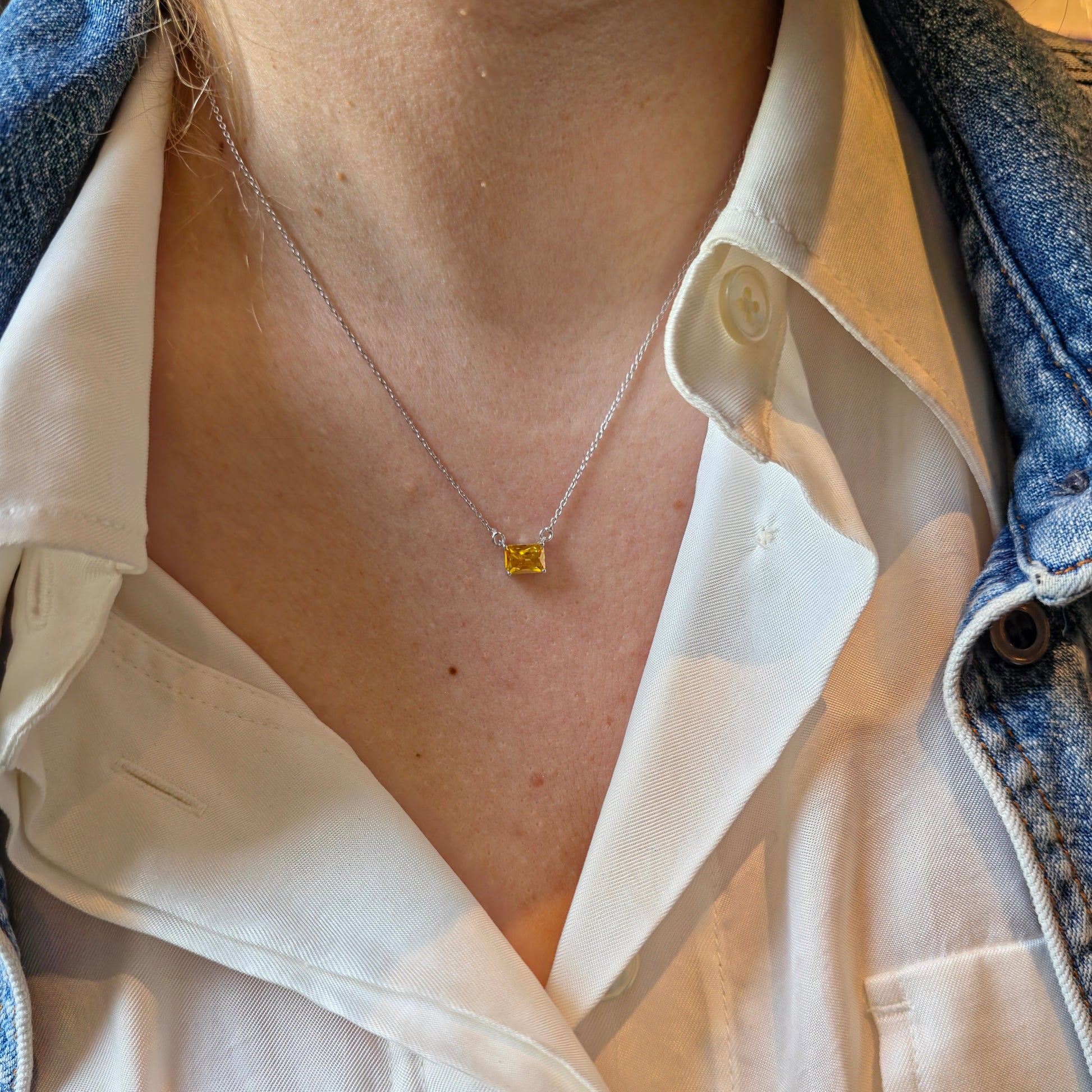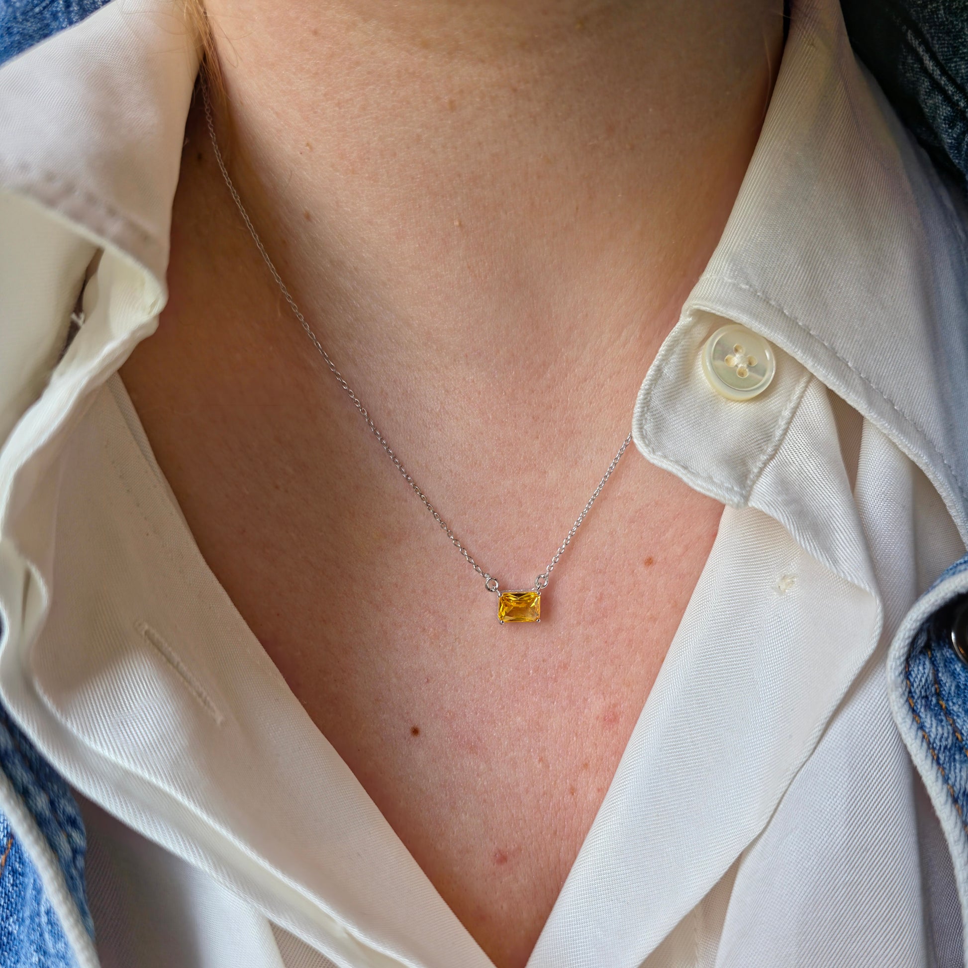 The Nexus Solitaire Necklace is a refined essential - a single emerald cut 5x7mm gemstone suspended between delicate links. With its crisp geometry and subtle presence, it adds a thoughtful accent to any look, from everyday minimalism to elevated layering.  The standard necklace length is 40 cm with a 5 cm extension (16” + 2”). Available in all Atlas Carré signature colours.