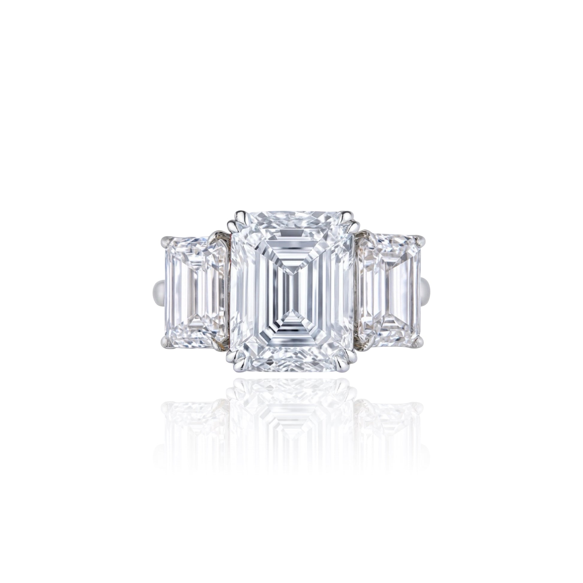 A 7ct ring with three emerald cut gemstones prong-set in a rounded band