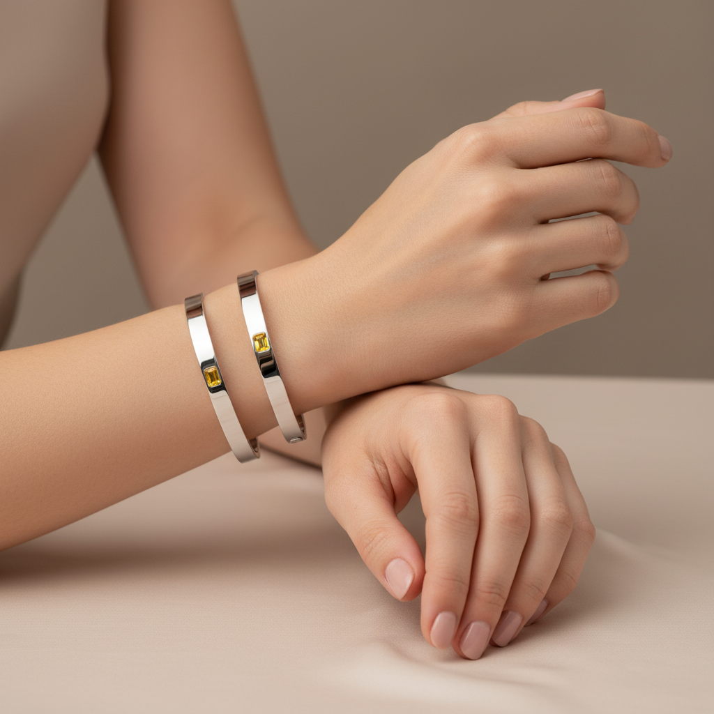 The Nexus Uno Elemental Bangle is a modern classic - an architectural oval bangle with a hinged opening, a clean 6 mm flat-edge profile, and a single bezel-set emerald-cut gemstone at its centre. Balanced and understated, this piece combines the quiet power of pure geometry with the subtle brilliance of a solitary stone. Polished to perfection, designed to layer or wear solo.