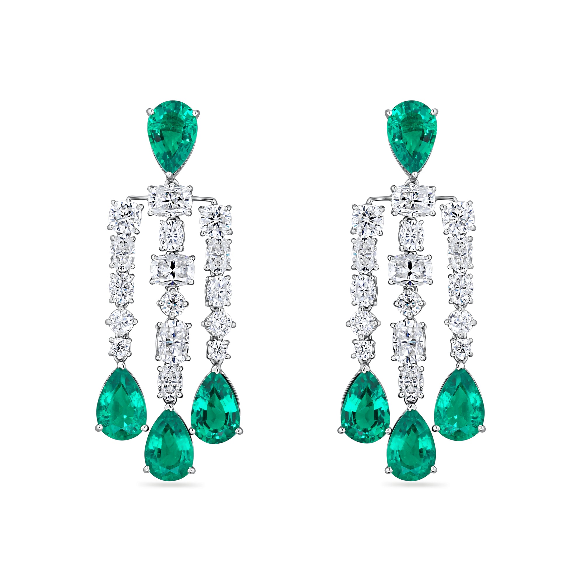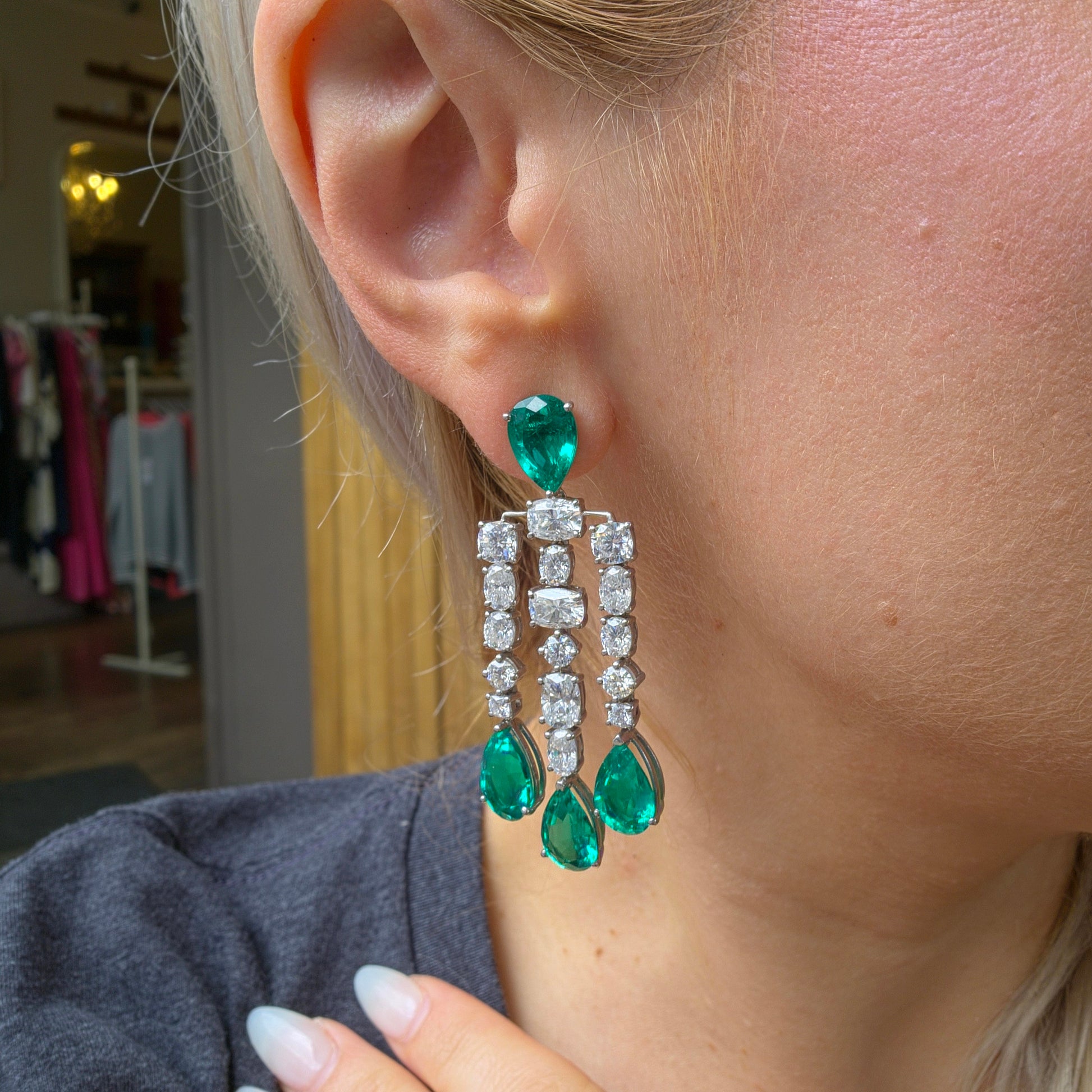The Nova Cascade Earrings are unapologetically architectural - a showstopping trio of vertical lines set with mixed-cut diamonds, anchored by three pear-shaped emeralds in motion. A single pear emerald at the top sits flush to the ear, giving way to a rhythmic, articulated descent of sparkle and colour. The geometric layout and repetition create a striking visual tempo, designed to catch the light from every angle. A limited edition design from the Atlas Carré Atelier. Can be made in all Atlas Carré signature colours, by request.