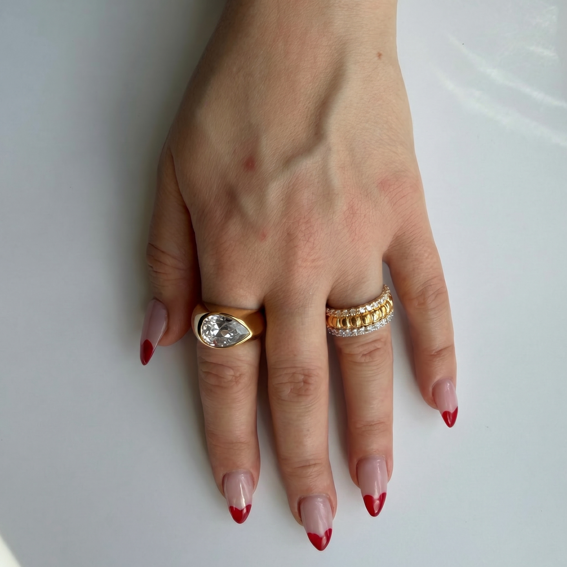 A sculptural signet built around a laterally set pear-cut gemstone, held flush within a smooth, continuous surface. The form is bold and rounded, with a softened profile that carries the weight of the ring while keeping it controlled on the hand.