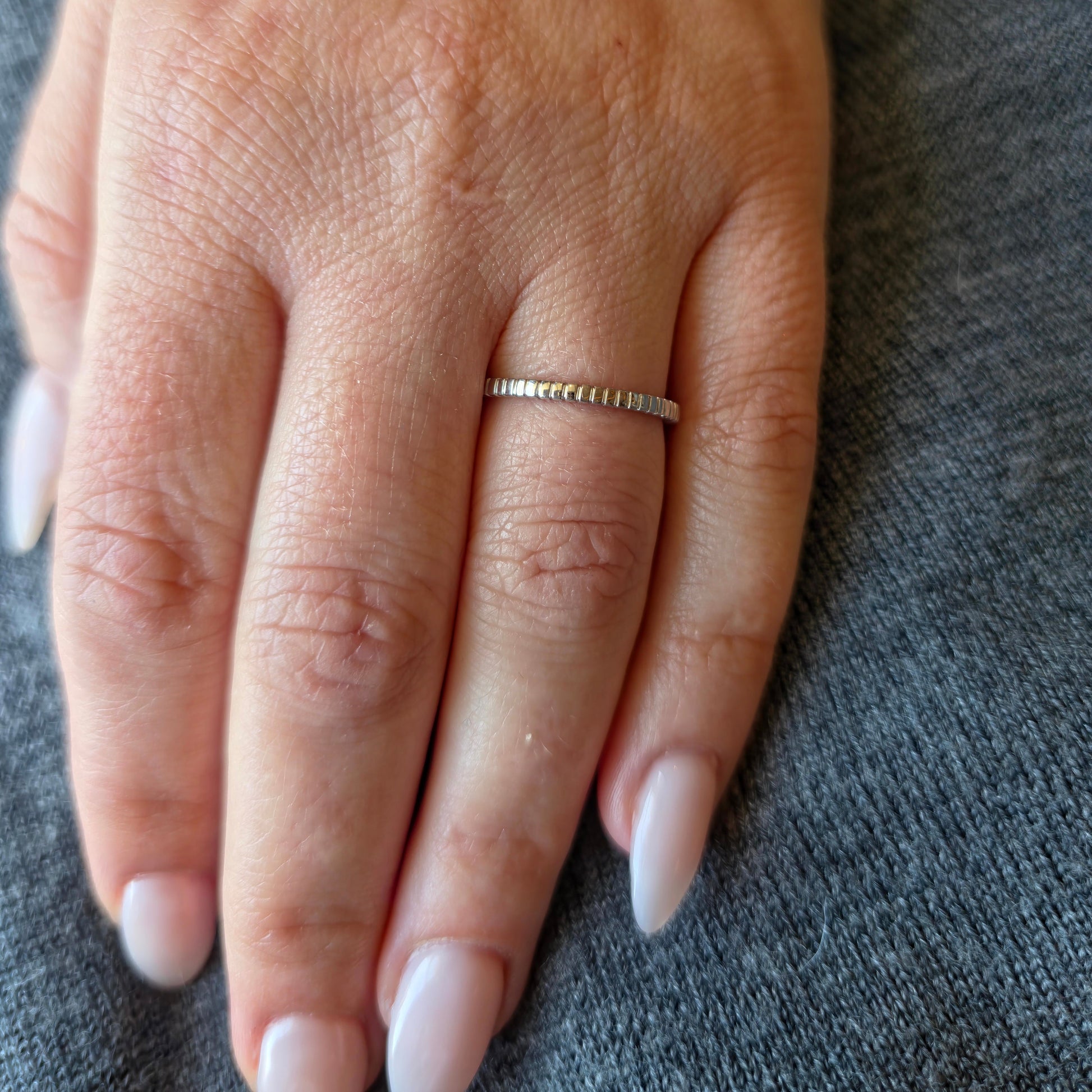 A super-slim ridged band - fine lines, subtle texture, effortless stacker