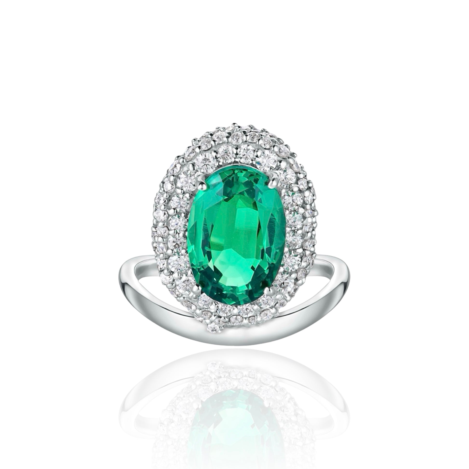 The Velara Crest Ring is a striking composition of light, height, and asymmetry. A luminous oval gemstone is framed by a mosaic-set pavé surround - a seamless surface of miniature diamonds arranged in an organic, multidimensional field. Perched just above the polished band in an offset position, the centre stone appears to hover, giving the design an airy, architectural elegance. Bold yet refined, this ring is a modern take on regal tradition. Available in all Atlas Carré signature colours, White Diamond excepted.