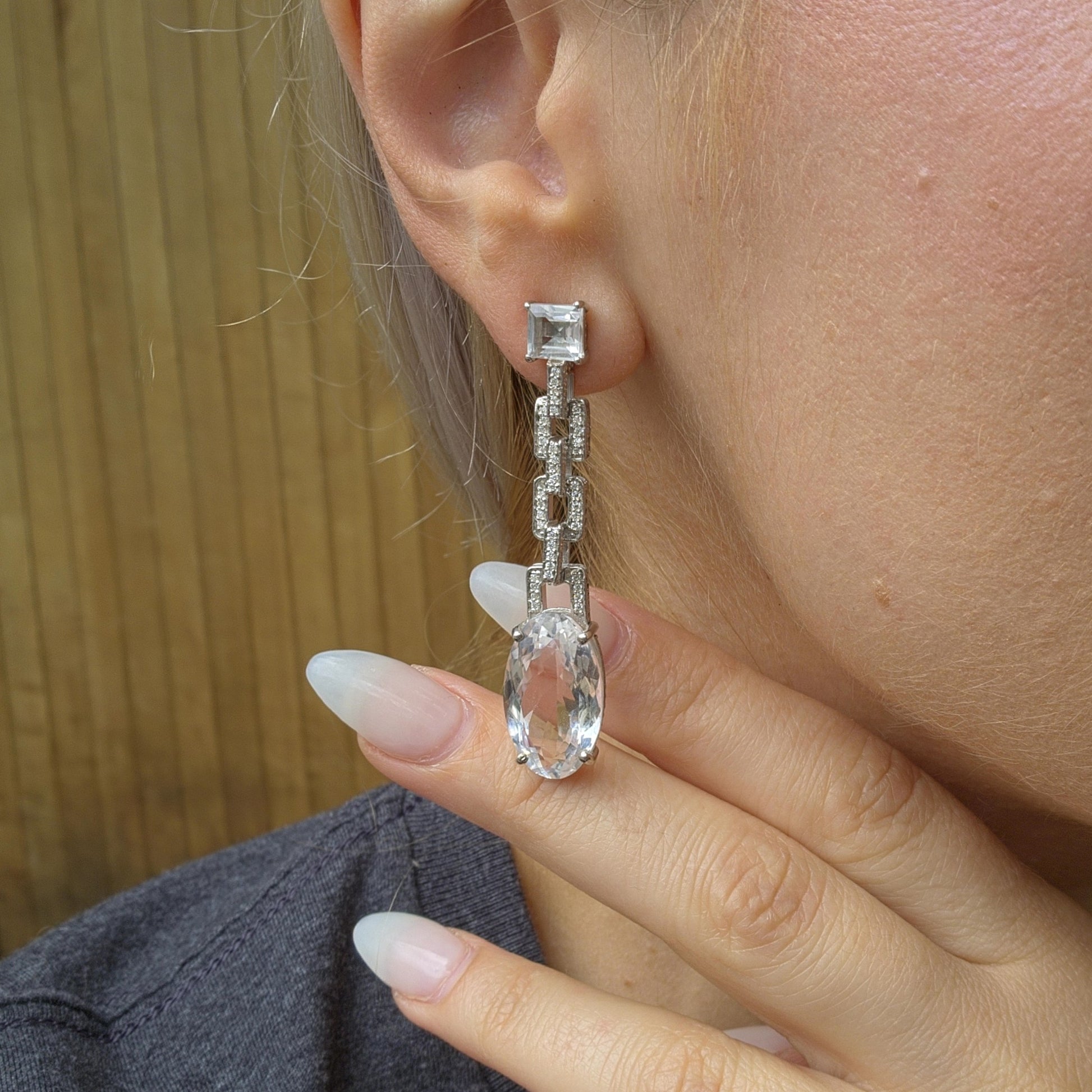 The Velara Drop-Link Earrings are built around contrast and clarity. A luminous elongated oval of custom-cut rock crystal anchors the design, suspended from a structured chain of pavé-set square links. Above, a matching Asscher-cut rock crystal stud echoes the crisp geometry of the drop, creating a seamless vertical silhouette. Sculptural and precise, these earrings balance softness and edge - a quiet statement with enduring presence. A limited edition design from the Atlas Carré Atelier.