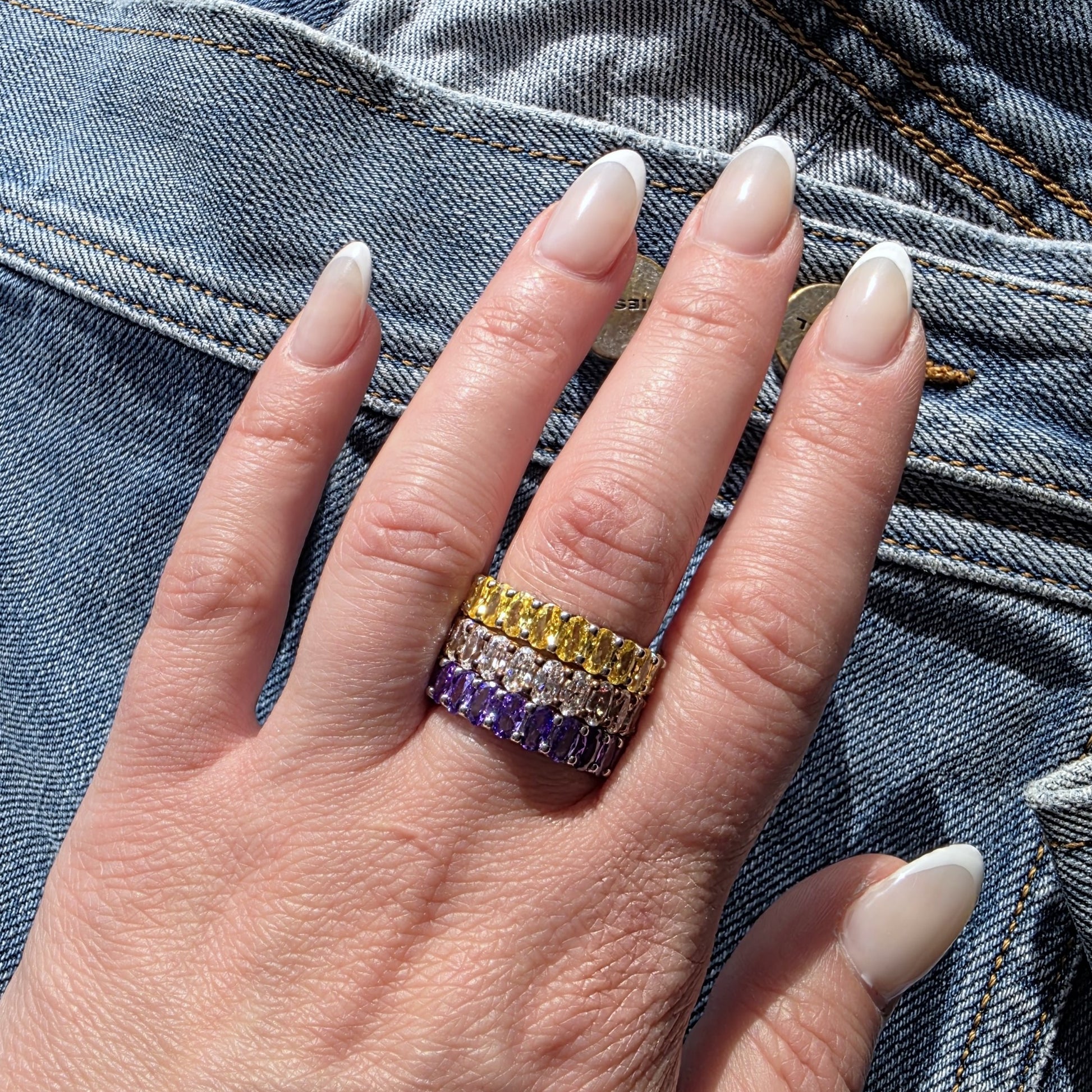 The Velara Eternity Ring brings colour and presence in equal measure. Set with oval-cut gemstones in a continuous band, it wraps the finger in a vibrant line of light. Substantial in scale and rich in character, this piece stands beautifully on its own or anchors a stacked look with confident brilliance. Available in all Atlas Carré signature colors.