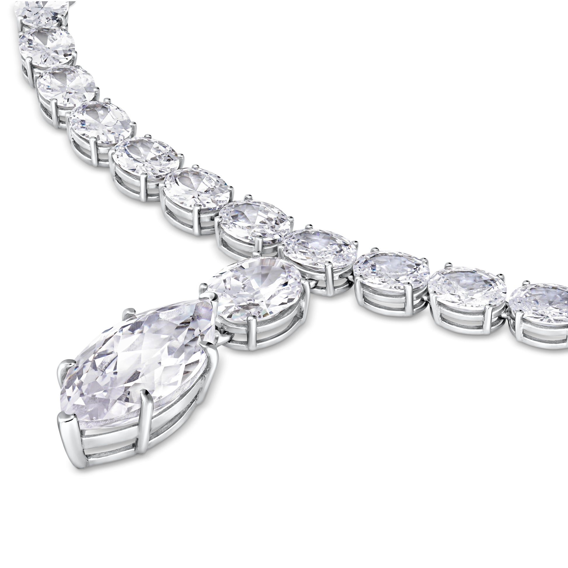 The Velara Grand Necklace commands attention with its sculptural silhouette and luminous presence. At the centre, a dramatic 24×12 mm (15 ct) marquise-cut gemstone is paired with a 12×10 mm oval-cut accent above it, anchoring a radiant line of 9×7 mm oval stones that continue around the neckline. Each stone is prong-set to maximise brilliance and movement while preserving a refined structure. A statement in proportion, precision, and light. Designed to make an entrance - and leave a lasting impression.