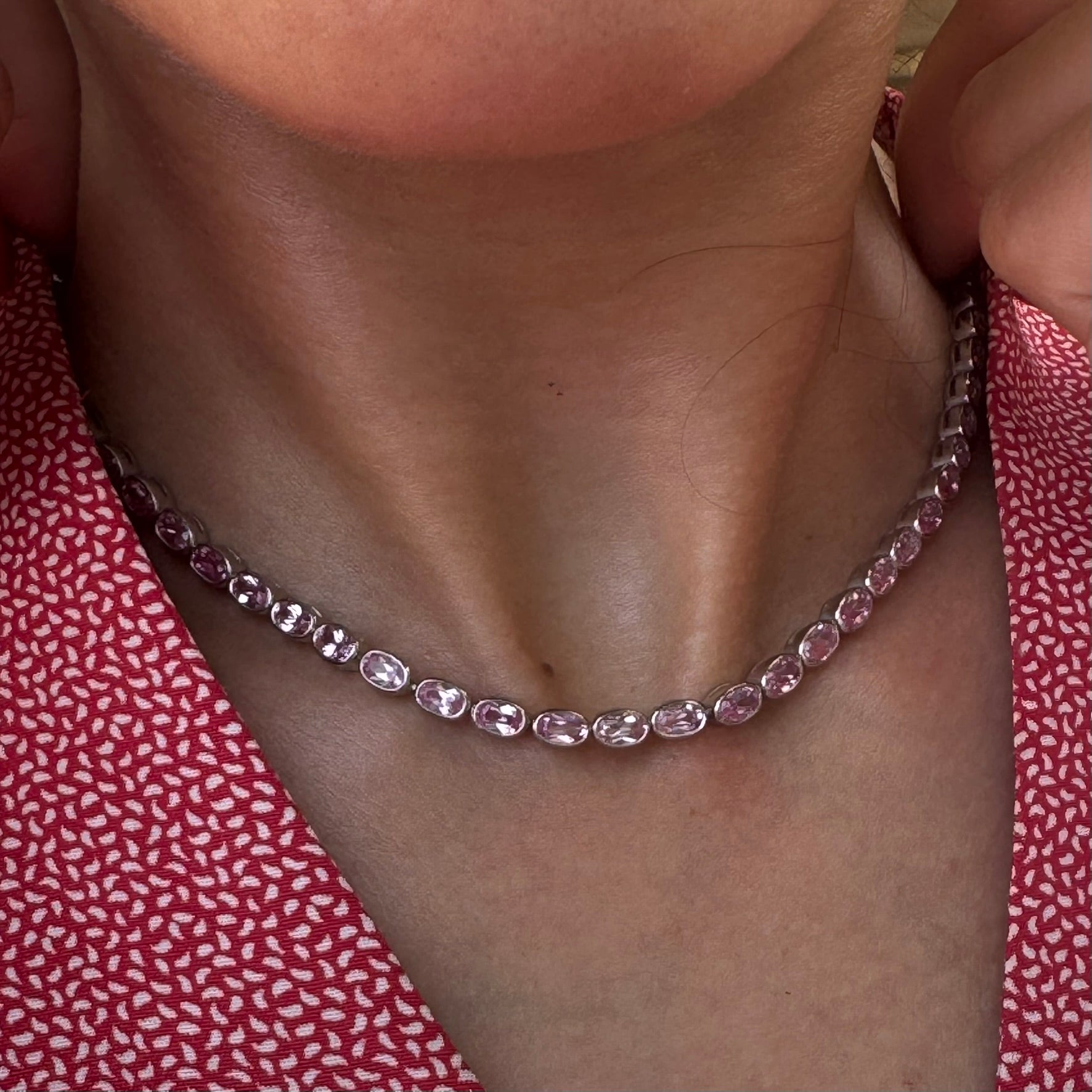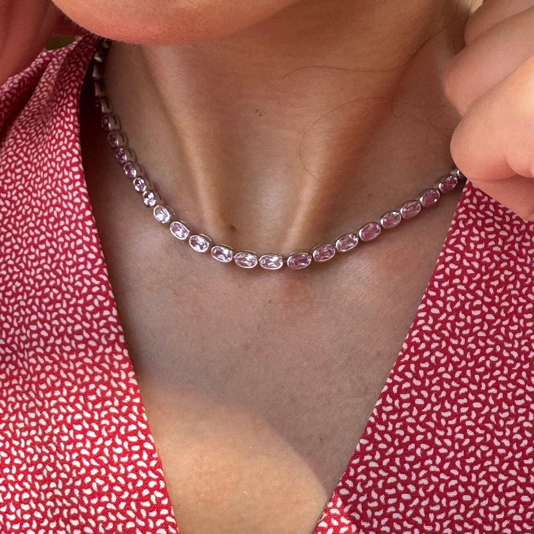 A refined tennis necklace featuring oval-cut gemstones set in seamless bezels