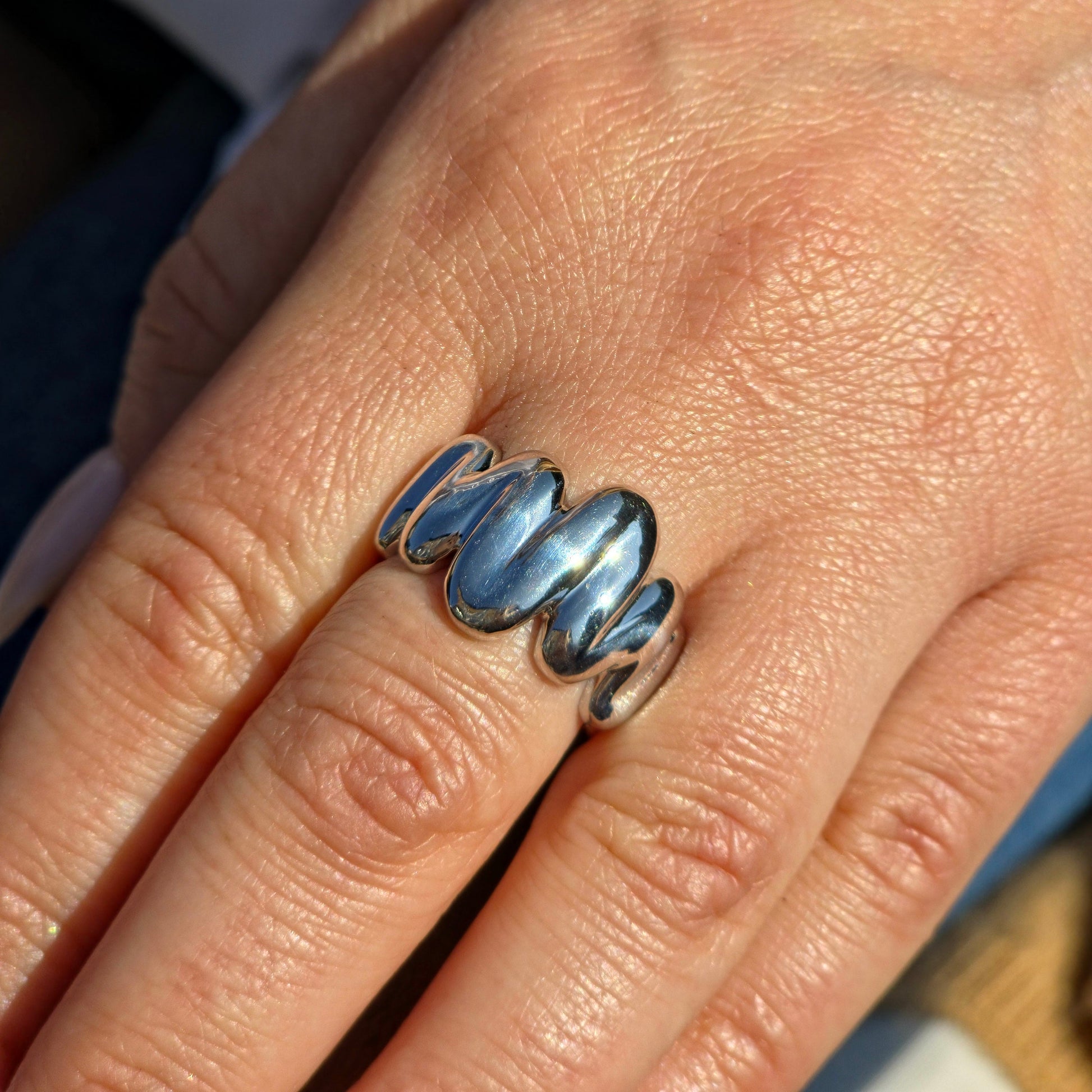 The Wave Ring ripples with rhythm and shine. Its undulating form flows like liquid metal, creating a bold yet playful texture that wraps the finger in sculptural motion. A true standout piece with organic elegance.